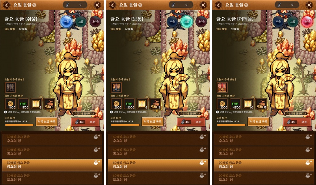 각 요일 동굴 콘텐츠는 플레이 방식은 비슷하나 보상이 요일 별로 다른 게 특징입니다. 그중에 현실 금요일에 돌 수 있는 "금요 동굴" 콘텐츠는 클리어 시 많은 인게임 금화를 벌 수 있기 때문에 초보부터 고수 레벨 때까지 꾸준히 돌아주면 제법 짭짤한 인게임 재화를 벌어 들일 수 있는 콘텐츠 중에 하나입니다.