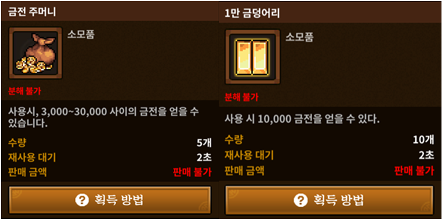 금요의 정(금요 동굴) 어려움 난이도 클리어 보상기준으로 1만 금전으로 바로 교환할 수 있는 "1만 금덩어리" 10개와 3천 금전에서 3만 금전 사이의 랜덤 금전을 보상으로 교환할 수 있는 "금전 주머니" 5개 그리고 클리어를 하게 됨과 동시에 받은 일반 금전이 "3천 금화"입니다.