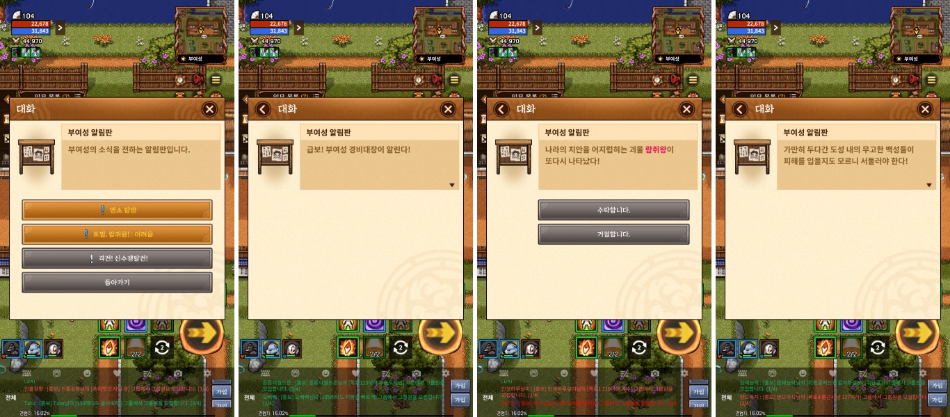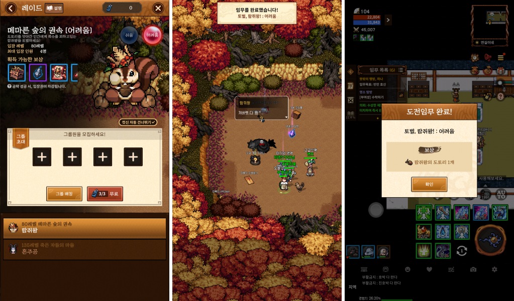 고구려성, 부여성에 각각 존재하는 왈숙이랑 연실이네 주막에 있는 알림판에 가면 받을 수 있는 일일 미션인 "토벌, 람쥐 왕 : 어려움" 퀘스트를 받은 뒤 죽지 않은 상태로 메마른 숲의 권속 레이드를 어려움 난이도로 클리어하면 되는 조건입니다.