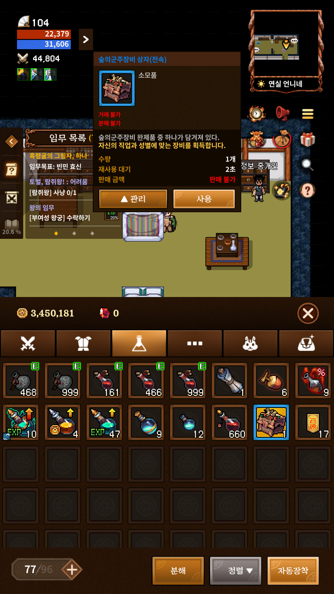 기왕에 105 레벨 혼주공 퀘스트를 진행하기 전까지 람쥐 왕 레이드를 지속적으로 돌 예정이라면 재료도 아낄 수 있고 안되더라도 분해를 통해서 영혼의 파편을 얻을 수 있는 나름 절약형 퀘스트인 만큼 꾸준히 돌아주는 게 중요할 듯합니다.