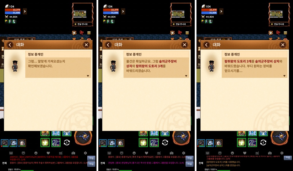 정보중개인 이라는 NPC에게 퀘스트를 받기 전에 꼭 잊지 마시고 "람쥐왕의 도토리 3개" 모은 다음 퀘스트를 클리어하게 되면 드디어 숲의 군주 장비 상자 한 개를 교환으로 받을 수 있습니다.