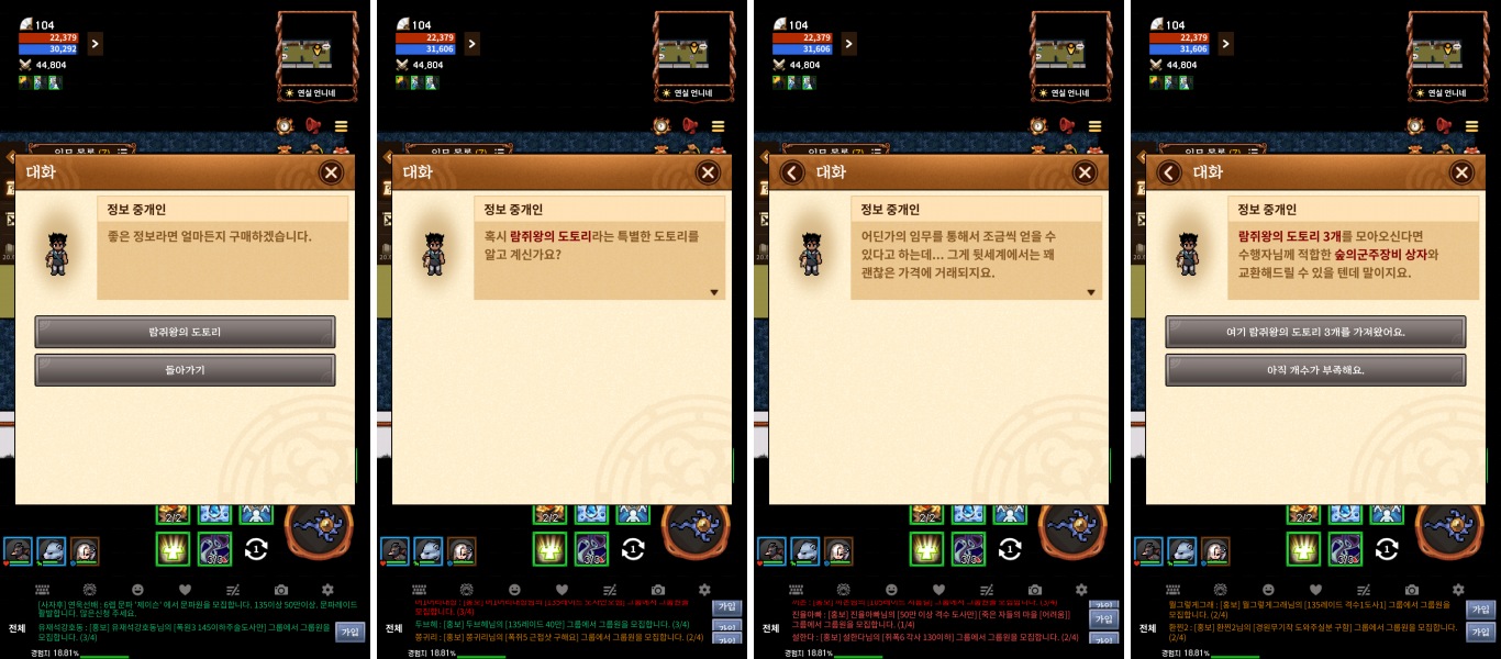 그렇게 해서 총 3개의 "람쥐왕의 도토리"를 모았다면 왈숙네와 연실이네의 주모 NPC가 있는 건물의 바로 옆 건물인 "왈숙 언니네" 혹은 "연실 이모네"가 있는 건물에 짱 박혀 있는 "정보 중개인"이라는 NPC에게 가서 교환을 진행해야 합니다.