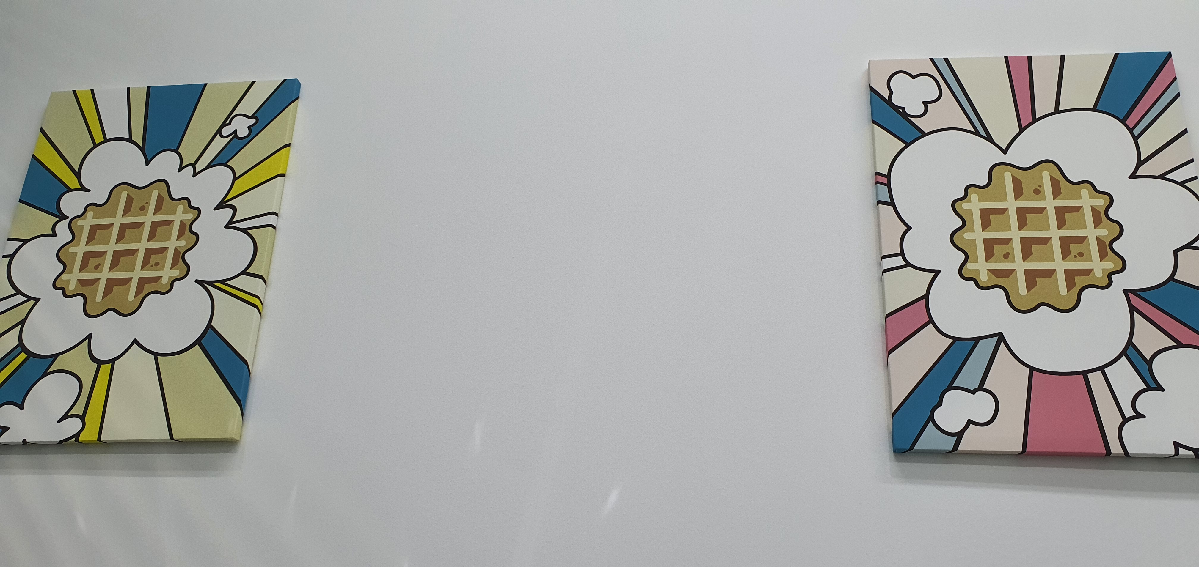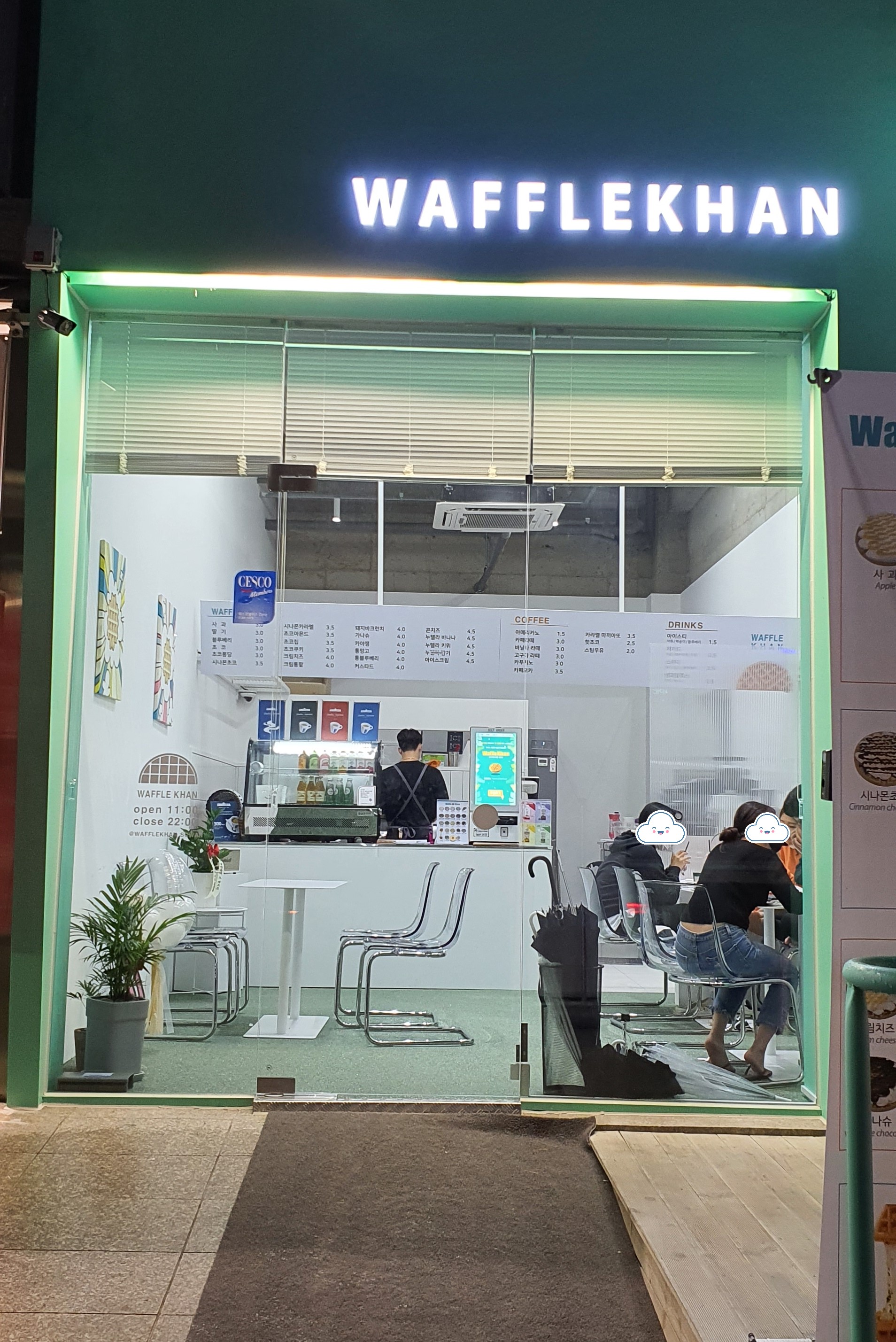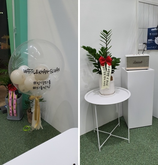 가게명은 "WAFFLE KHAN" 혹은 "와플칸" 이라는 곳이었습니다. 가게 내부는 신상 가게답게 깔끔하게 정리 정돈이 되어 있는 모습과 가게 오픈을 축하하는 환들이 여럿 보였습니다.