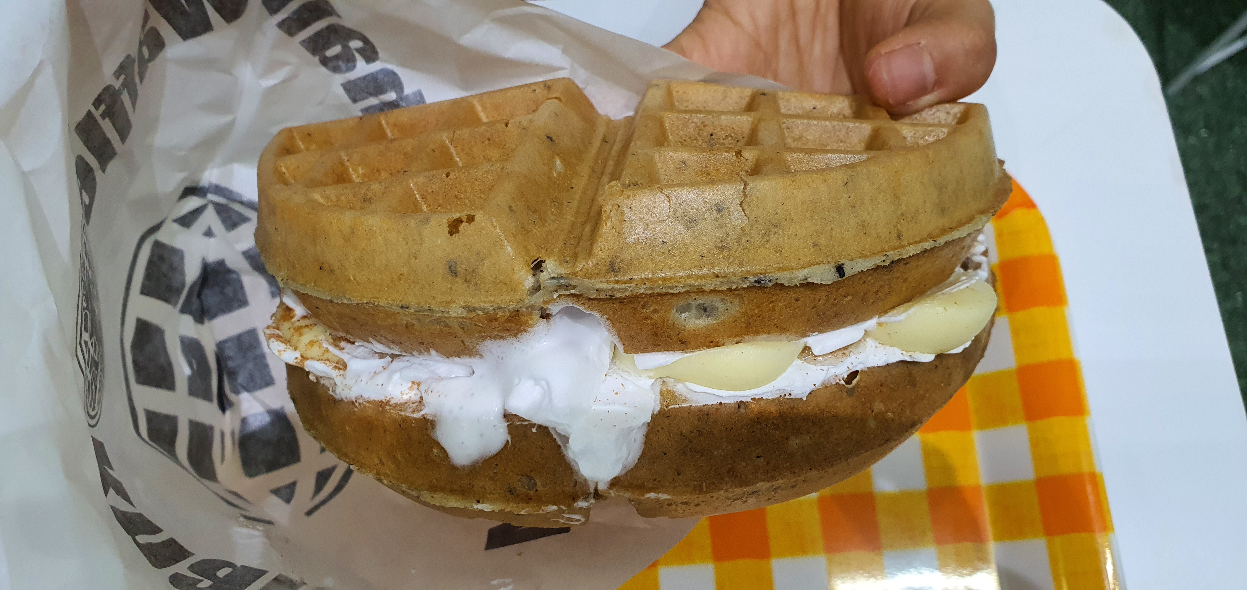 일단 와플을 받고 나서 잠깐 당황스러웠던 게 세상 살면서 이렇게 큰 와플은 처음 받아 봐서 좀 놀랐었습니다. 거의 제 손의 2배 가까운 길이와 손바닥 만한 두께의 와플의 디테일에서 한번 놀라고 안에 들어 있는 사과잼과 크림 사이즈에 한번 더 놀랐었습니다. 이 날 저녁에 배고파서 저녁을 때울 생각으로 먹은 건 아녔었지만 와플 하나를 먹고 배불러서 혼난 건 이 가게가 제 인생 통틀어 최초였습니다. 와플 사이즈, 크림 양, 사과잼의 맛의 3중주가 정말 잘 어우러진 하나의 잘 조율된 하모니였었습니다.