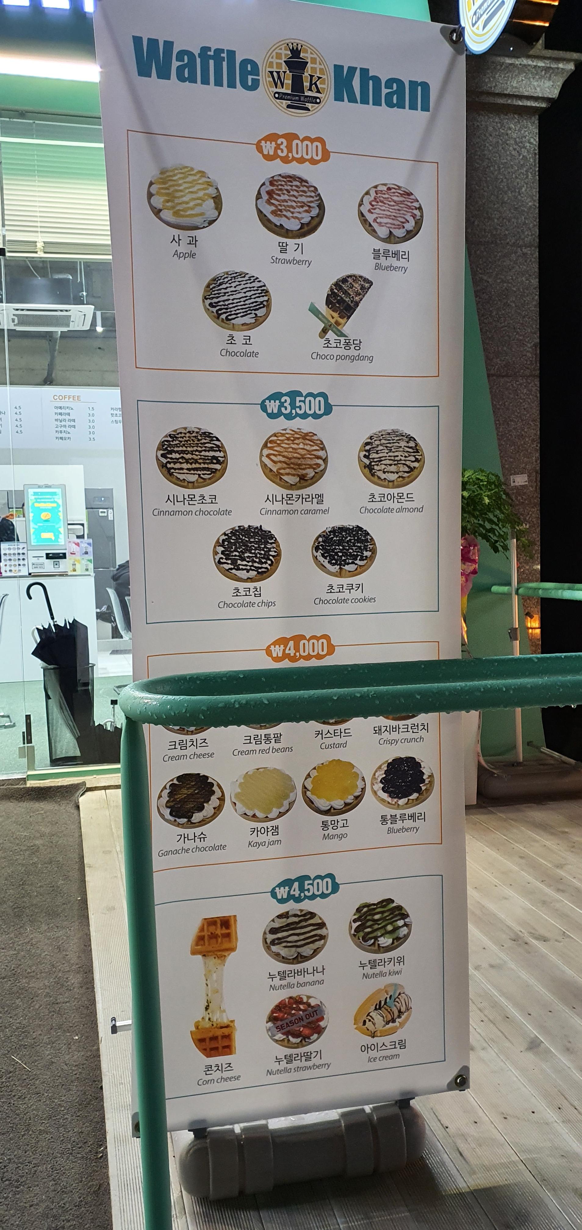 와플 종류가 옛날에는 끽해봐야 플레인, 사과, 초코, 시나몬 정도였는데 정말 별의별 메뉴가 다 있다는 생각이 들 정도로 이곳 와플칸의 와플 메뉴는 정말 많았습니다. 밖에서 나름 뭘 먹을지 정리를 하고 들어갔는데도 막상 키오스크를 통해서 주문을 시키려고 오니까 선택 장애가 또 온건 안 비밀.