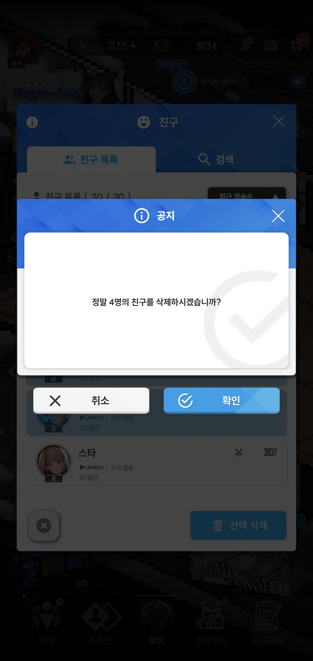 이렇게 친구를 골라서 삭제하는 기능이 활성화가 되면서 친구 삭제가 가능해집니다.