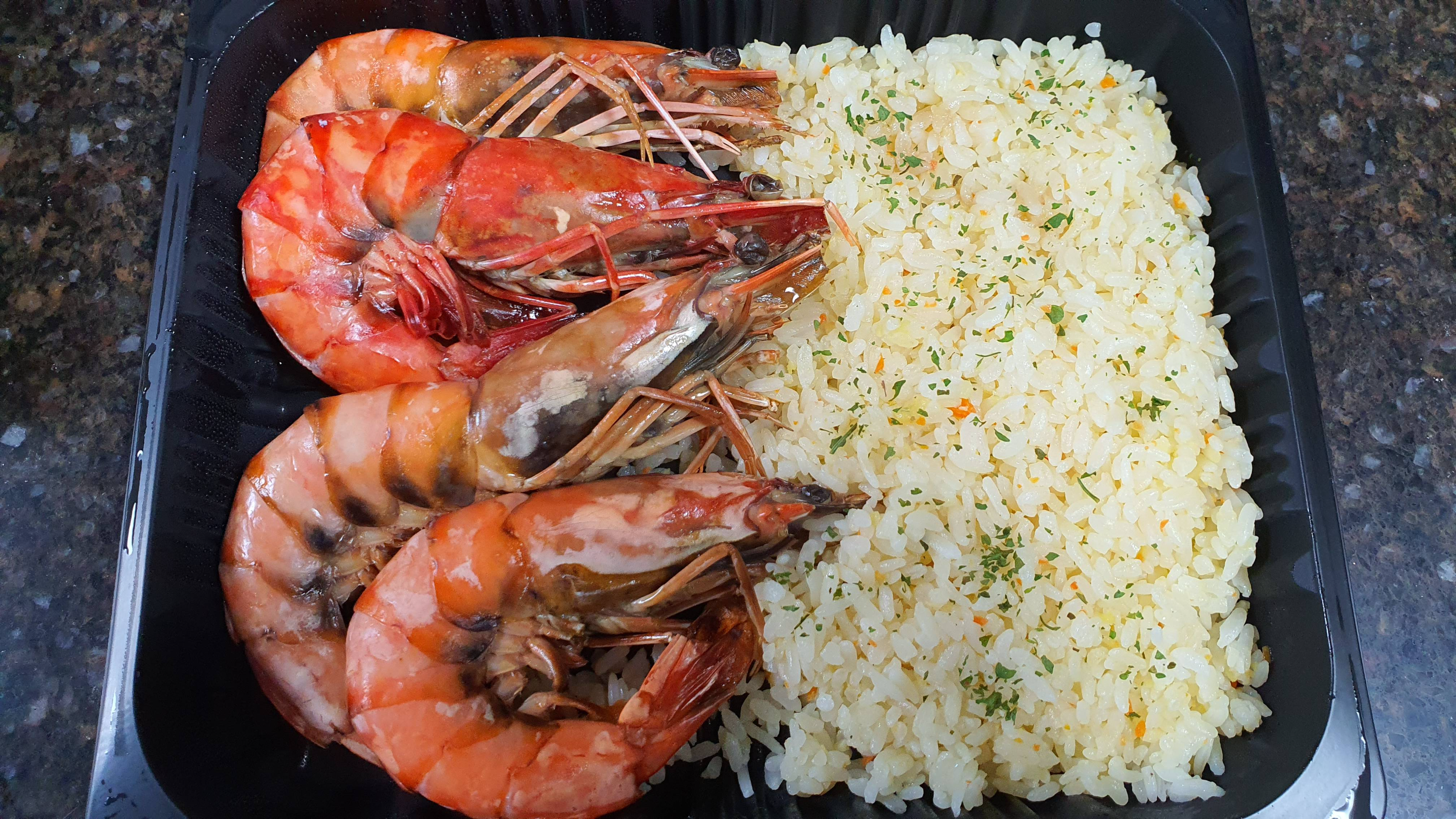 윤기 좔좔 흐르게 잘 구워진 블랙타이거 새우 4 마리와 대비되는 색감을 지닌 볶음밥입니다.
