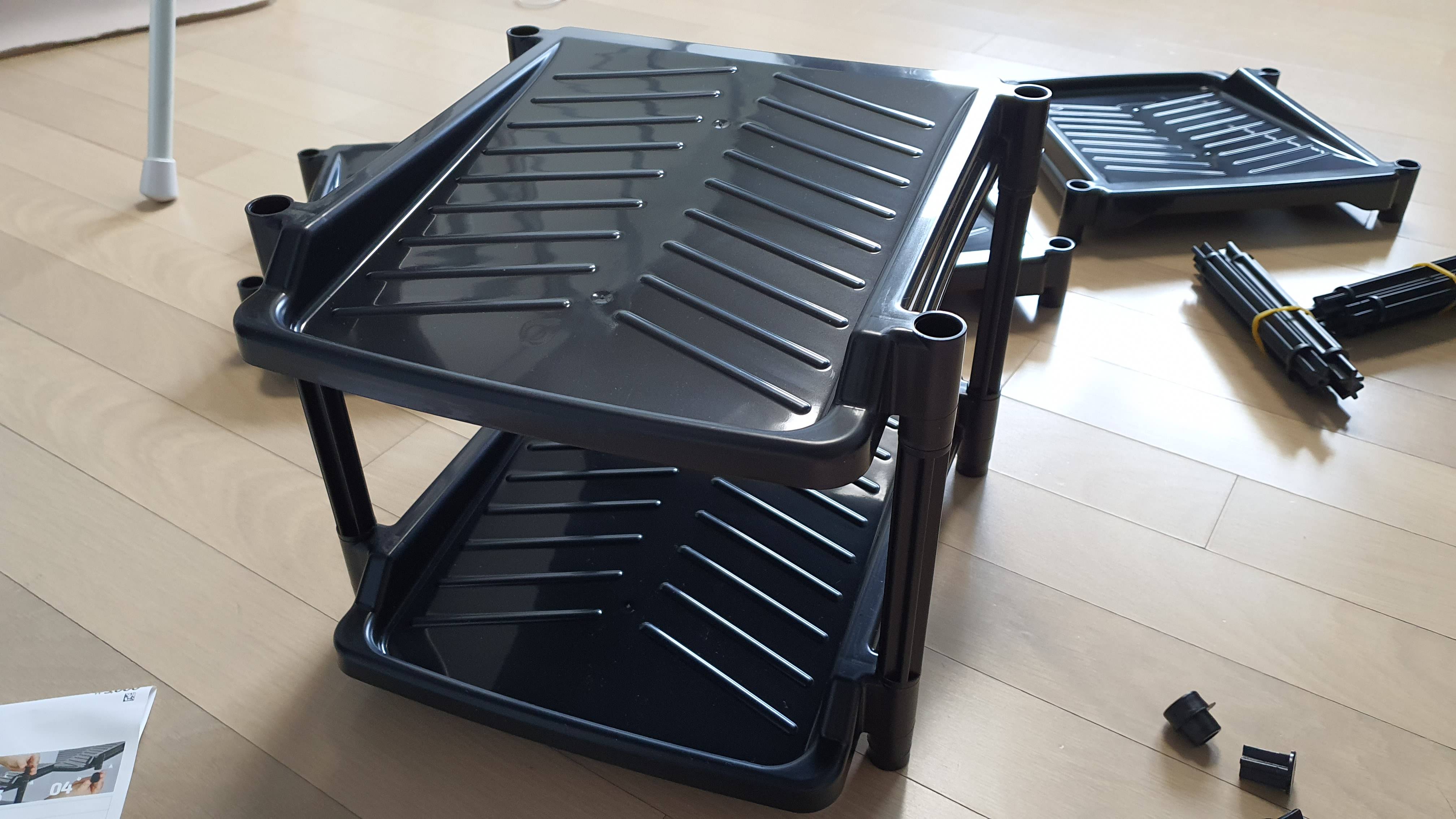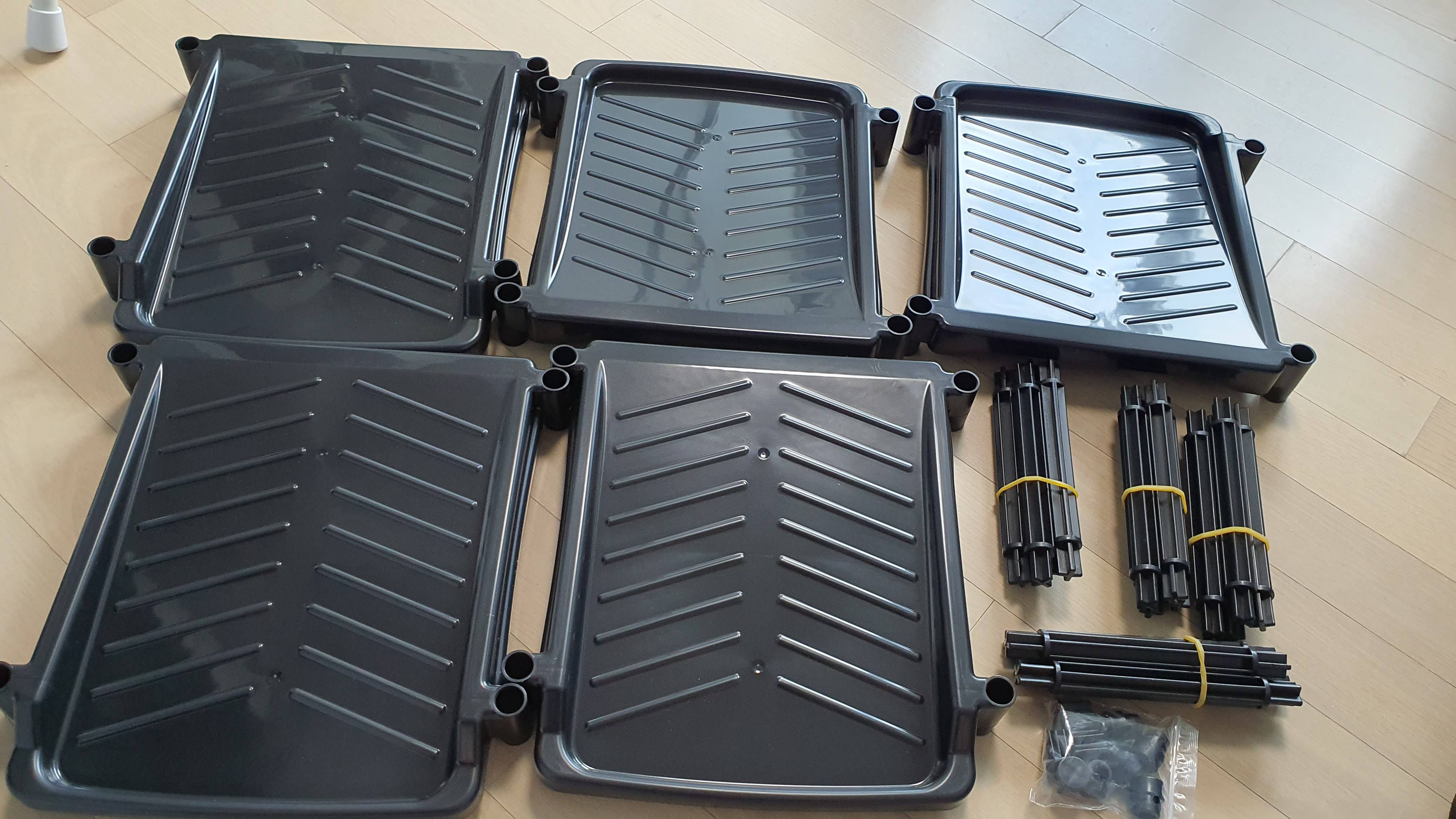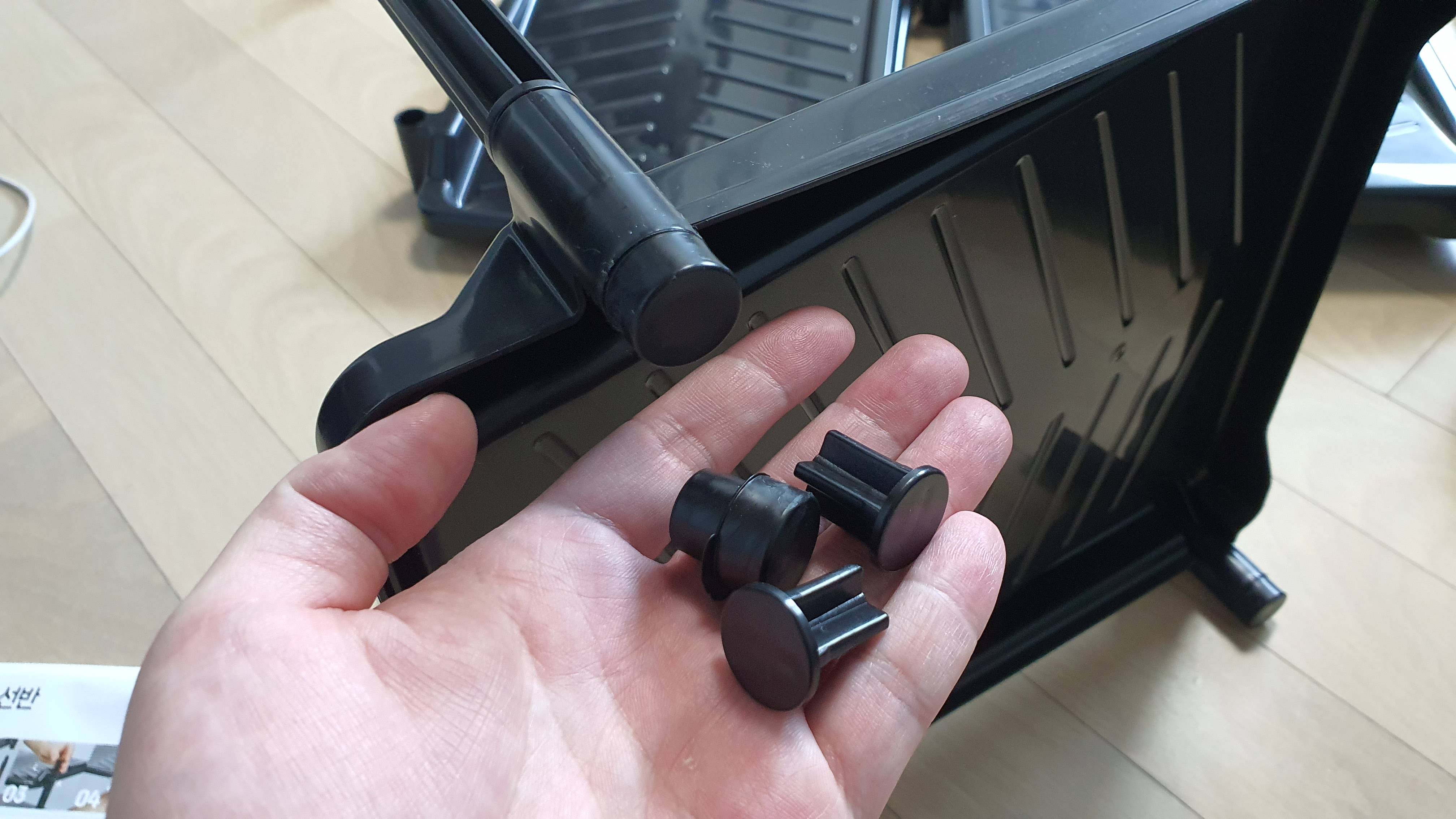 맨 윗단 선반 몸체의 각 튀어나온 기둥 4곳의 홈에 선반 몸체 마개를 끼워줌으로써 조립 완료입니다.
