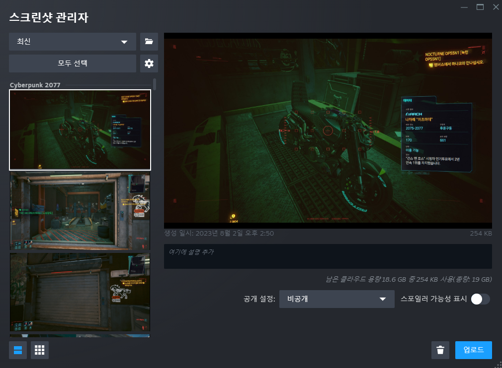 여기서 스팀 커뮤니티에 업로드를 하거나 아예 지우는 선택이 가능합니다.