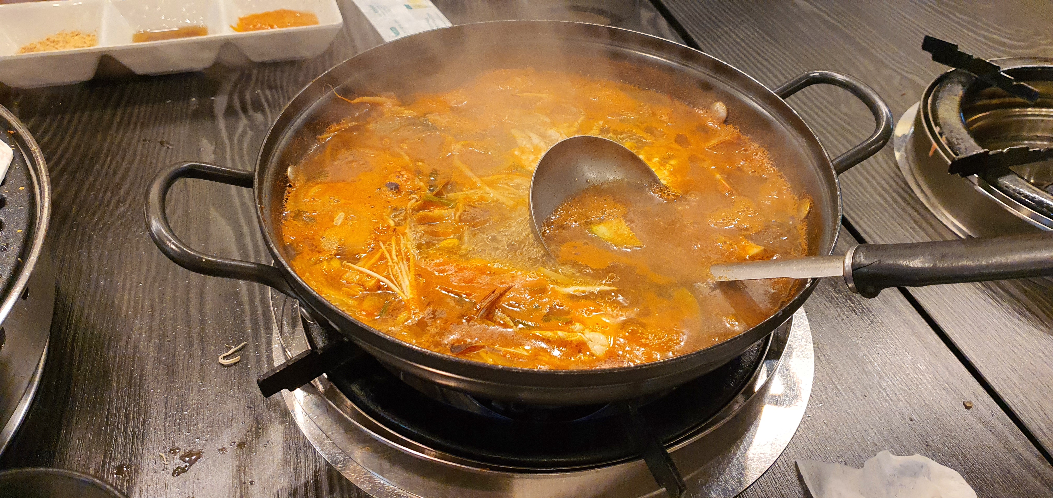 또 하나의 별미인 기본찬으로 나오는 "꽃게 새우탕" 이게 참 맛있습니다. 잘게 썰은 꽃게들과 콩나물, 파 등이 들어가서 칼칼한 또 하나의 해물탕을 먹는 느낌이었습니다. 개인적으로 고기를 구워 먹다가 라면사리라도 끓여서 먹을 생각이었지만 고기가 맛이 좋아 리필을 계속하는 바람에 배가 터질뻔해서 라면은 건너뛰었습니다. 이미 본판인 고기가 제맛을 내니까 다른 건 쳐다볼 겨를이 없더군요.