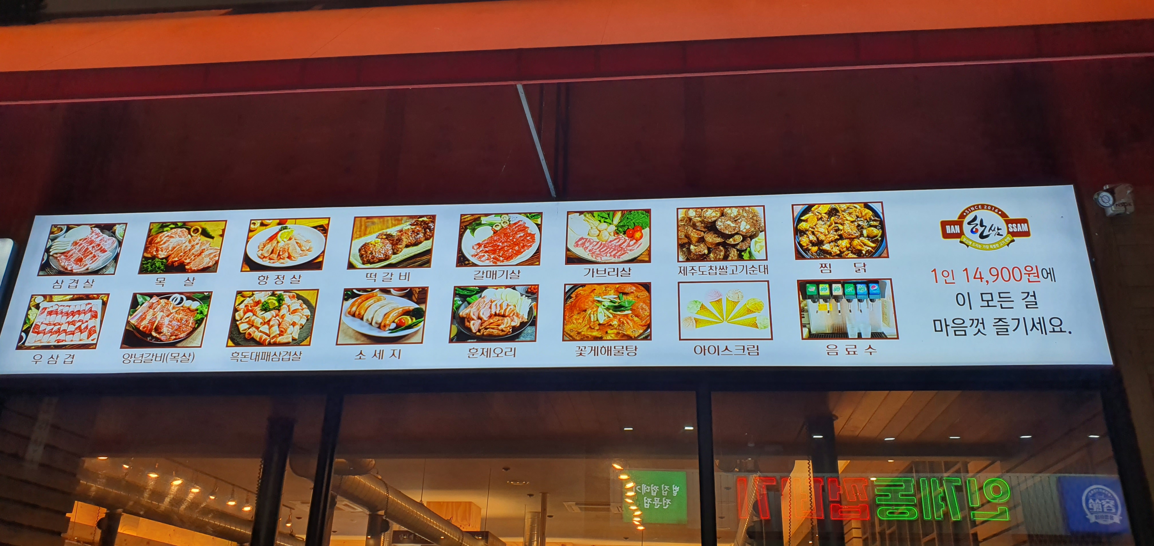 "한쌈"의 가격표는 상기와 같습니다. 주말/평일 구분 없이 저 가격대가 유지되며 가게에 들어가셔서 점원한테 자리를 배정받으면 바로 뷔페 이용이 가능하시며 나가면서 정산만 하면 됩니다. 성인 가격대가 조금 높다고 생각은 듭니다만 공깃밥, 음료 그리고 아이스크림이 무료로 제공되기 때문에 어떤 점에서는 약간의 타협이 가능하다고 봐야 하지 않을까 싶지만 그건 방문하시는 고객들의 몫으로 남겨 놓겠습니다.