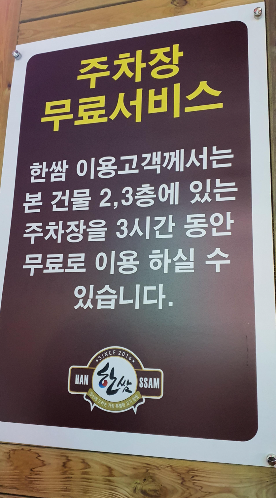 "한쌈"을 방문하시는 분들 중에 혹시라도 자가를 이용하신 분들은 먹자골목 특성상 차를 댈 수 있는 곳이 사실상 없다고 생각하시는 게 편하시기 때문에 한쌈의 정문에서 우측 골목으로 빠지면 바로 같은 빌딩 안으로 들어가는 주차장이 구비되어 있습니다. 3층까지 60여 대가 들어갈 수 있도록 널럴히 지어져 있으니 꼭 이용하시길 바라며, 식사를 하고 나오시면서 카운터의 직원한테 차량을 주차한 점과 차대번호를 알려주시면 차량 출차 시 무인 정산기에서 요금을 지불하지 않아도 되오니 꼭 참고하시기 바랍니다. 3시간 무료 이용도 잊지 마시고요.