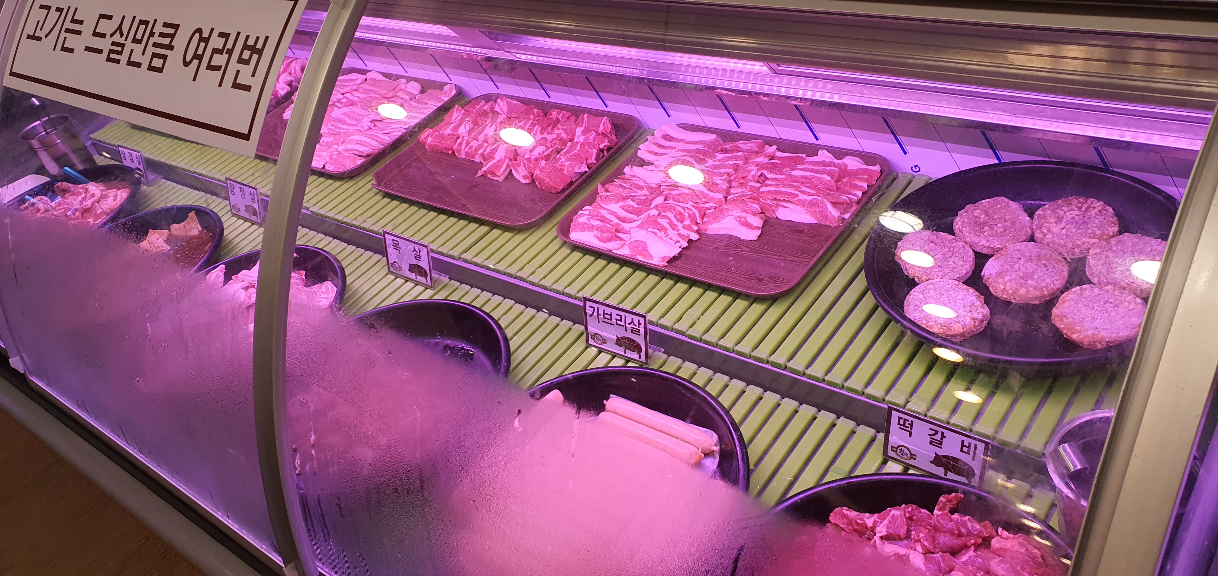 고기 뷔페답게 고기도 한쪽에서 손님들을 맞이하기 위해 그 빨간 자태를 뽐내면서 기다리고 있습니다. 사람들이 하도 몰려서 집게질을 하기 위해 다가와서 어쩔 수 없이 찍은 사진이라 제대로 못 찍어서 아쉬웠습니다.