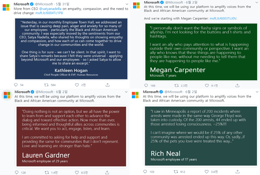 비게임사 중에서는 마이크로소프트가 있습니다. 마이크로소프트 공식 트위터를 가면 위 트윗 말고도 마이크로소프트에 근무하고 있는 임직원들이 매일같이 이번 유혈 사태에 대한 우려와 인권 존중에 관련된 트윗을 계속 올리는 걸 볼 수 있습니다.