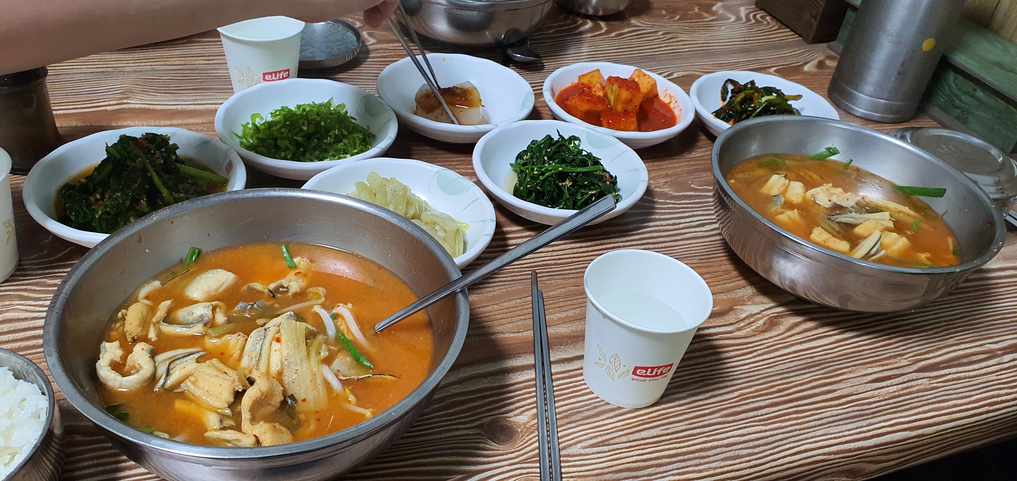 여기는 평동산단에서 근무하시는 분들이라면 모르는 분이 없는 정말 대표적인 맛집입니다. 전라남도 광주에서 애호박찌개를 먹으려면 이곳은 솔직히 들러줘야 하는 법이라고 조심스레 개인 의견 내봅니다. 점심시간에 가면 정말 앉을자리가 없습니다. 사진으로는 사람이 너무 많아서 대놓고 찍을 수가 없었지만 이미 오전 11시 반부터 빈자리가 없을 정도입니다. 그러면 밖에서 숫자가 적힌 주걱을 받고 기다려야 합니다.