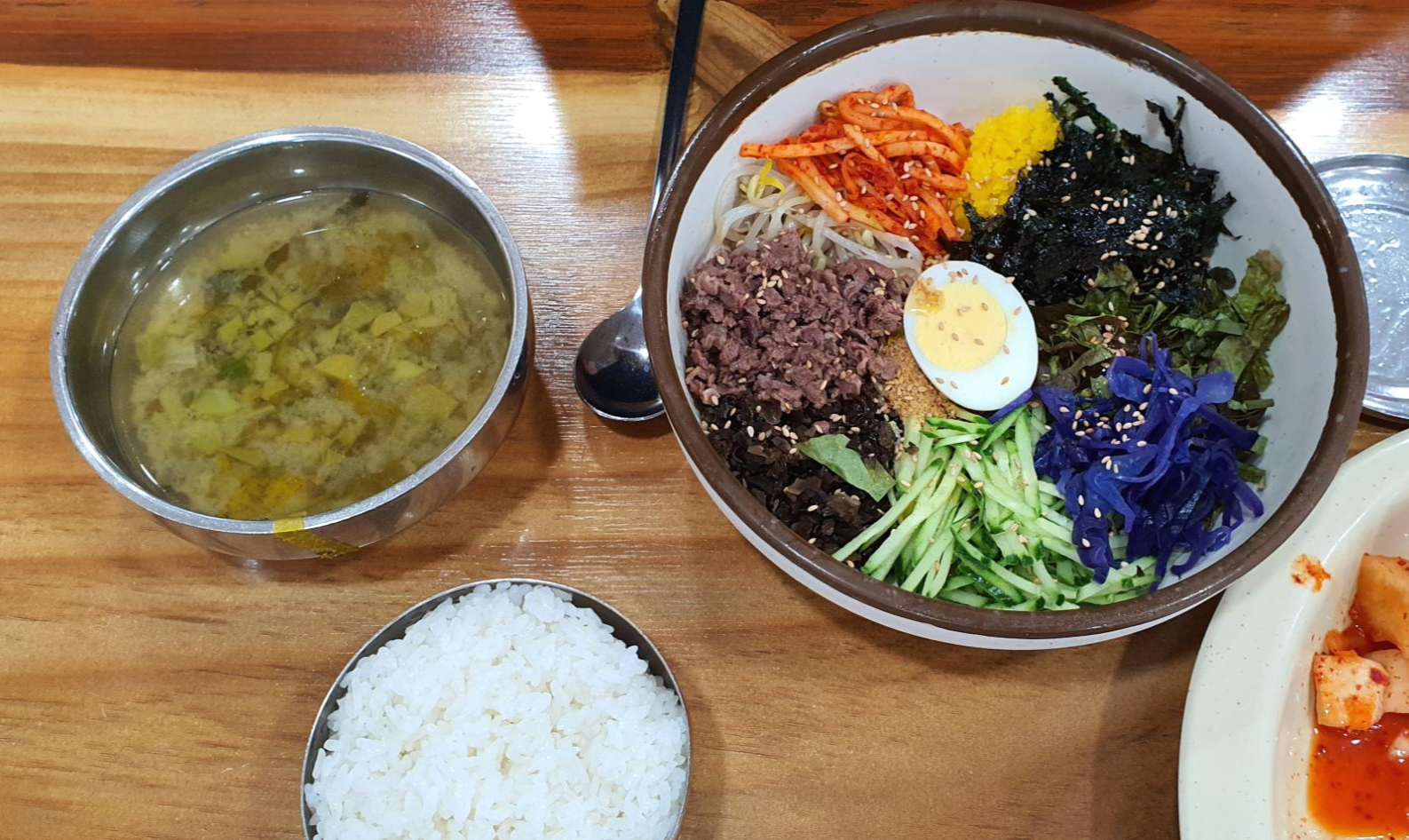 같이 갔던 일행이 먹었던 한우 익힘 비빔밥입니다. 이것도 비비기 전까진 그래도 애호박찌개에 비하면 양이 좀 덜할 줄 알았는데 웬걸 밥 한 공기 비비고 나니까 애호박찌개 못지않은 양의 비빔밥이 만들어졌습니다. 맛 역시 익혀진 한우를 비비니 맛이 없을 수가 없습니다. 같이 비빈 야채들도 이질적이지 않고 잘 어울리는 맛이었습니다.