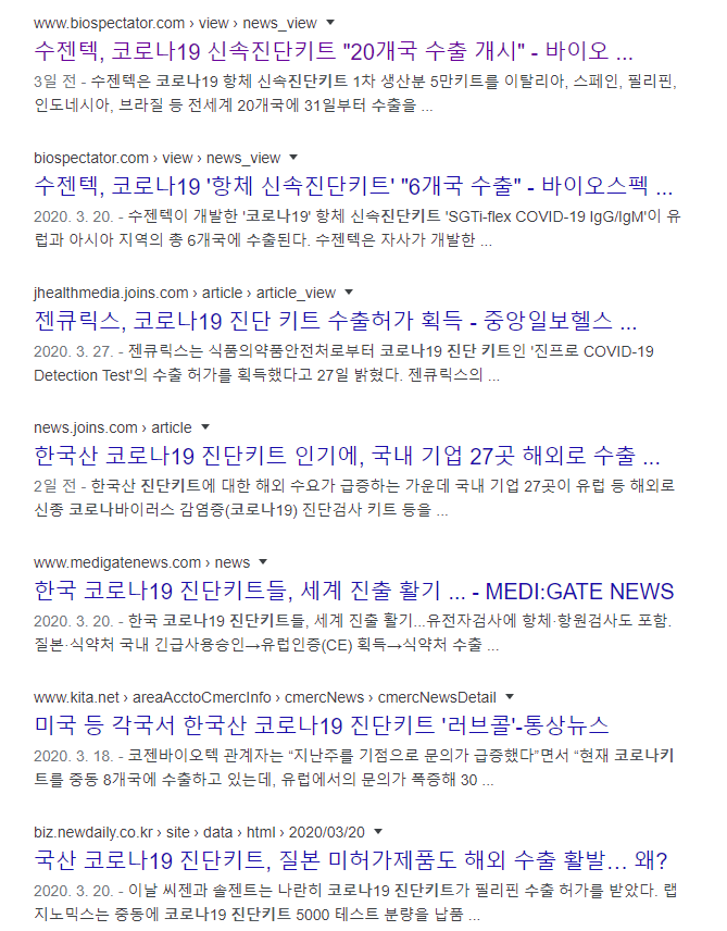 이러한 기술적 부분이 해외에서도 인정받아 국내 코로나 진단키트 생산 업체들의 수출길이 활짝 열린 건 당연지사인 상황이다.