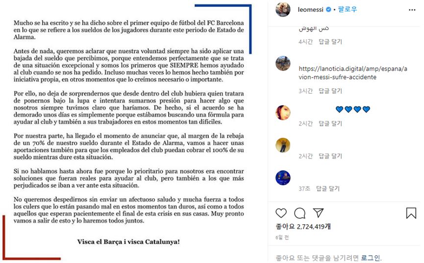 지난 3월 31일, FC 바르셀로나의 주장을 맡고 있는 리오넬 메시(Lionel Andrés Messi Cuccittini)가 개인 인스타그램에 글을 하나 작성하여 업로드를 하였습니다.