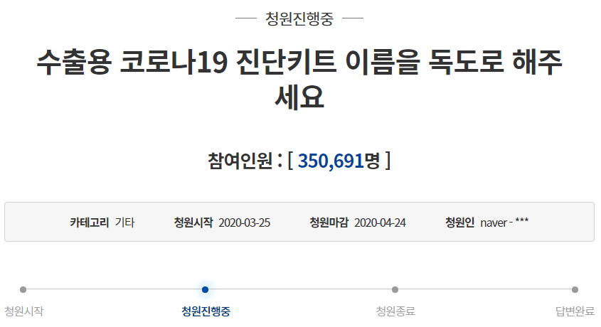 현재 청원 참여인원이 35만 명을 넘어선 상황인 한국산 코로나 진단키트의 수출모델들의 이름을 "독도"로 해달라는 청원의 내용이 바로 그것이다. 사실 국가 주도로 만들어진 백신이 아닌 어떻게 보면 사기업들에 의해서 만들어진 제품들이다 보니 이름이 각자 다를 수밖에 없긴 하겠지만 그래도 독도 라는 이름은 애국심 고취 및 이참에 독도라는 이름을 적어도 외국인에게 한번 정도는 지나가면서라도 들을 수 있는 이슈거리라도 만들면 그거만큼 좋은 광고 효과도 없을 것 같다고 개인적으로도 생각하는 바입니다.