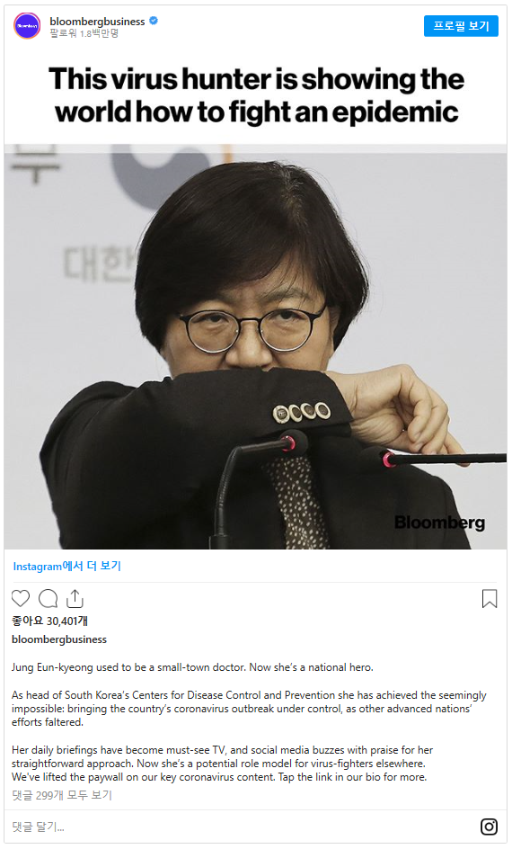 블룸버그의 인스타 채널에 소개된 정은경 본부장님의 내용은 아래와 같습니다.