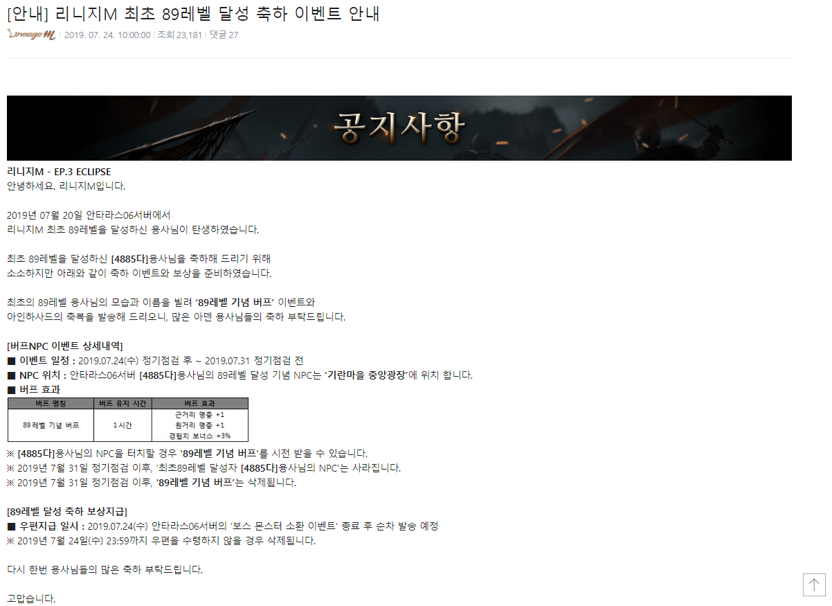 도대체 뭐하는 NPC인지 궁금해서 보니까 역시나 리니지M 공식 홈페이지에 신규 공지와 업데이트가 진행되었었네요.