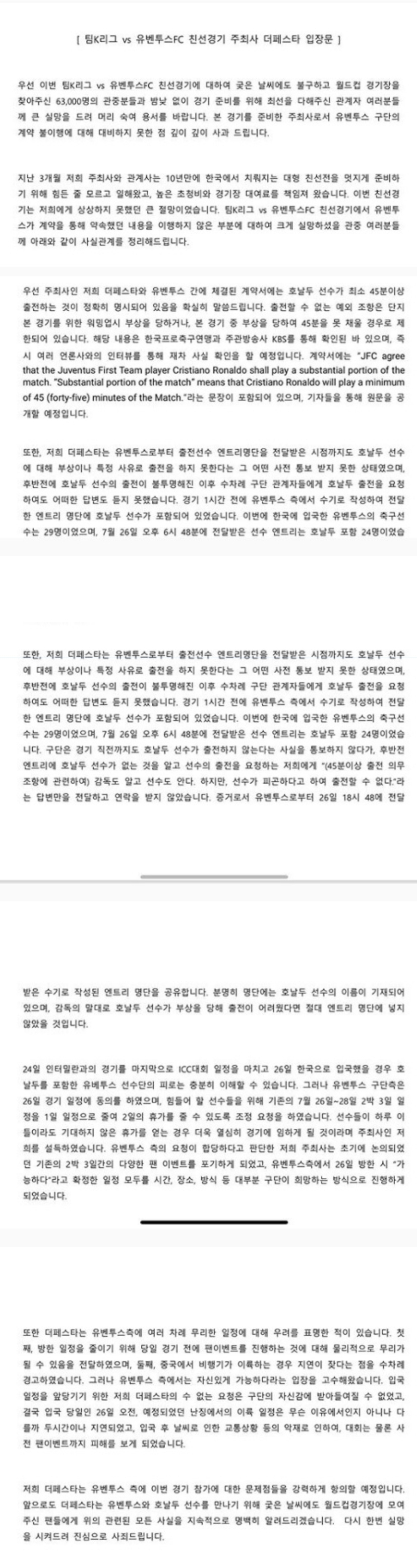 이번 친선경기의 주최를 맡아 진행했던 한국 기업인 더페스타 측은 유벤투스 FC 측과의 계약 간에 날강두 선수의 45분 경기 참가 조건을 명시했었으며 이에 관해서는 현재 한국 현지 언론들한테 입장문을 통한 주장을 하는 중입니다.