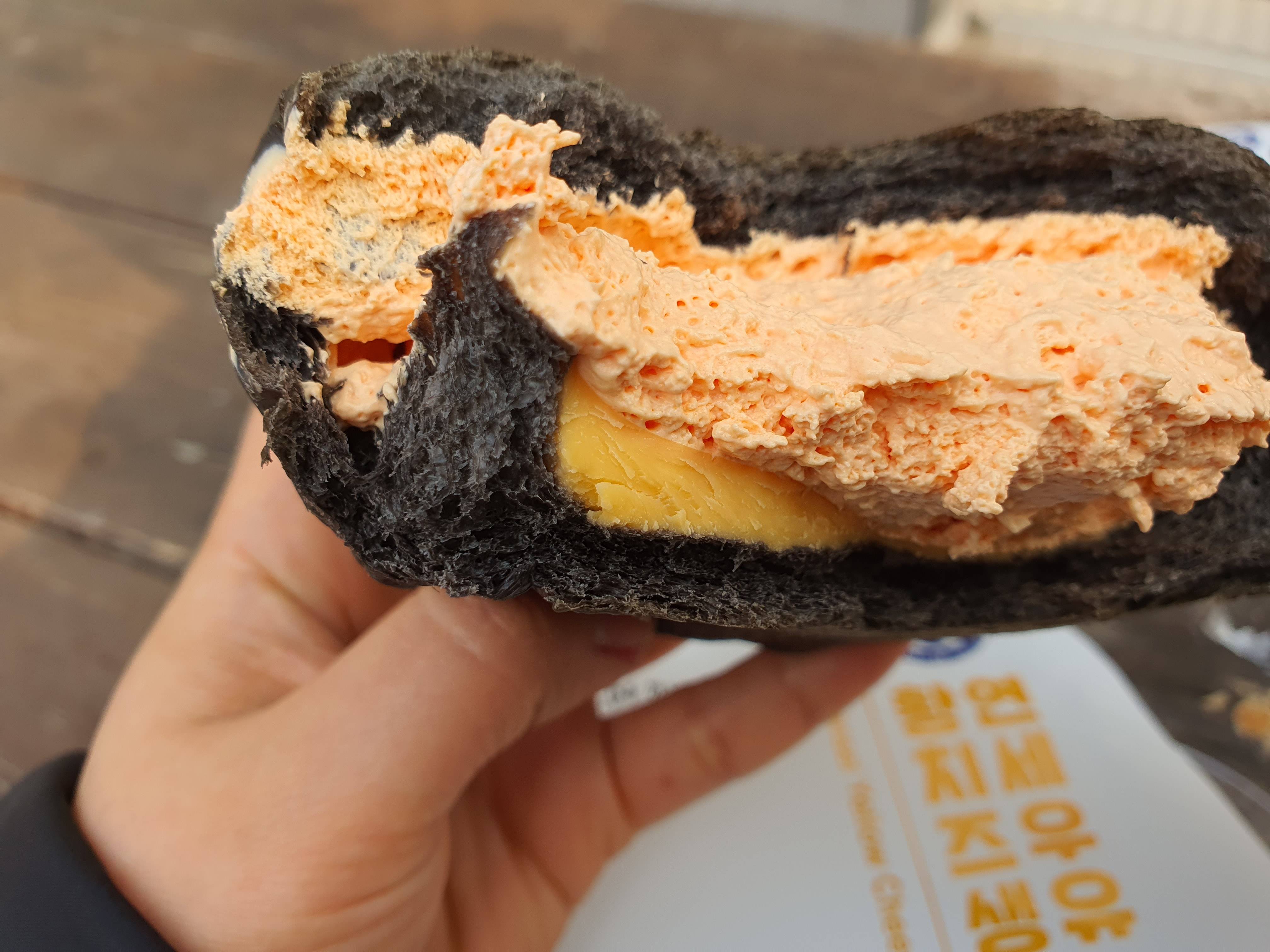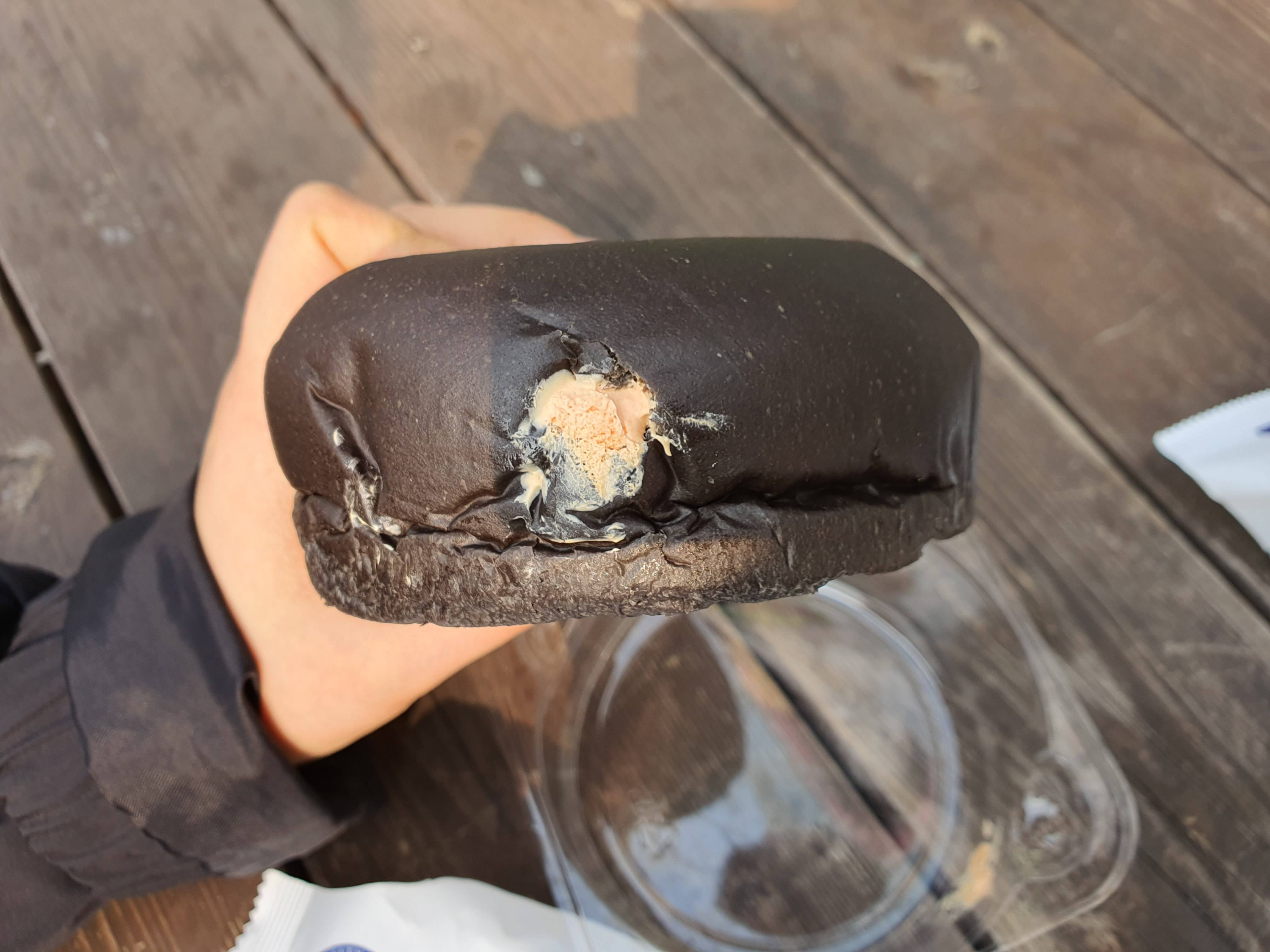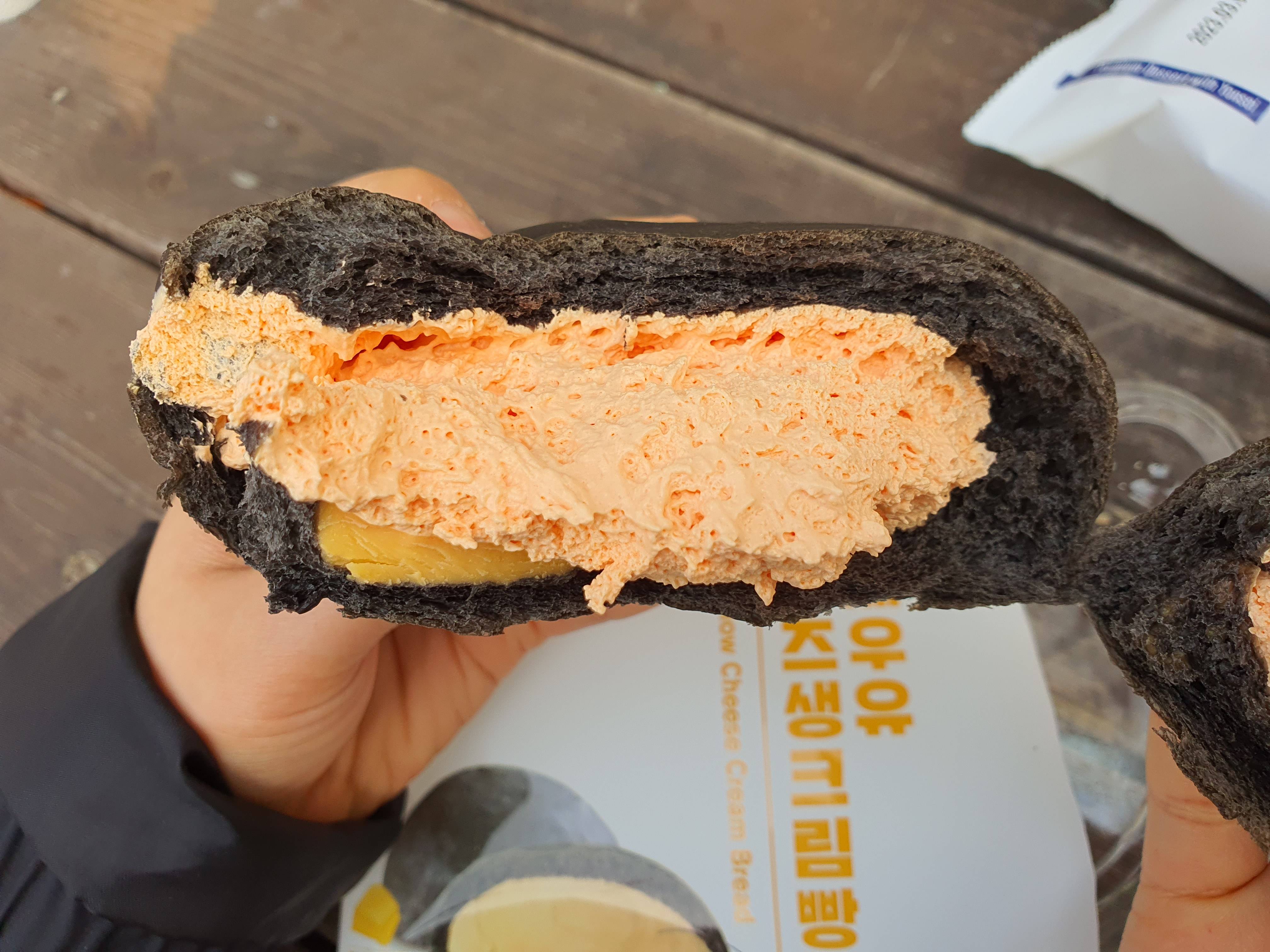 맛 평가를 하자면 먹물번 자체는 그냥 평범한 편인데 크림을 먹다 보면 과자 뽀또가 생각 나는 맛이 느껴집니다.