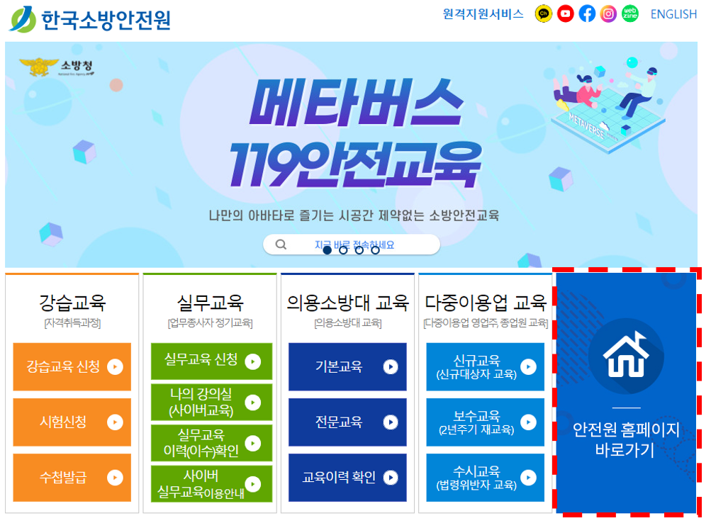 상기에 링크해 놓은 한국소방안전원 메인 사이트에 접속을 하신 뒤에 처음으로 뜨는 메인창에서