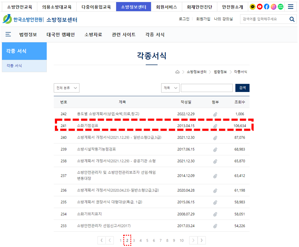 "소방정보센터" 상단 배너를 클릭해서 이동을 하게 되면 소방점검과 관련된 수많은 각종 서식을 이미 무료로