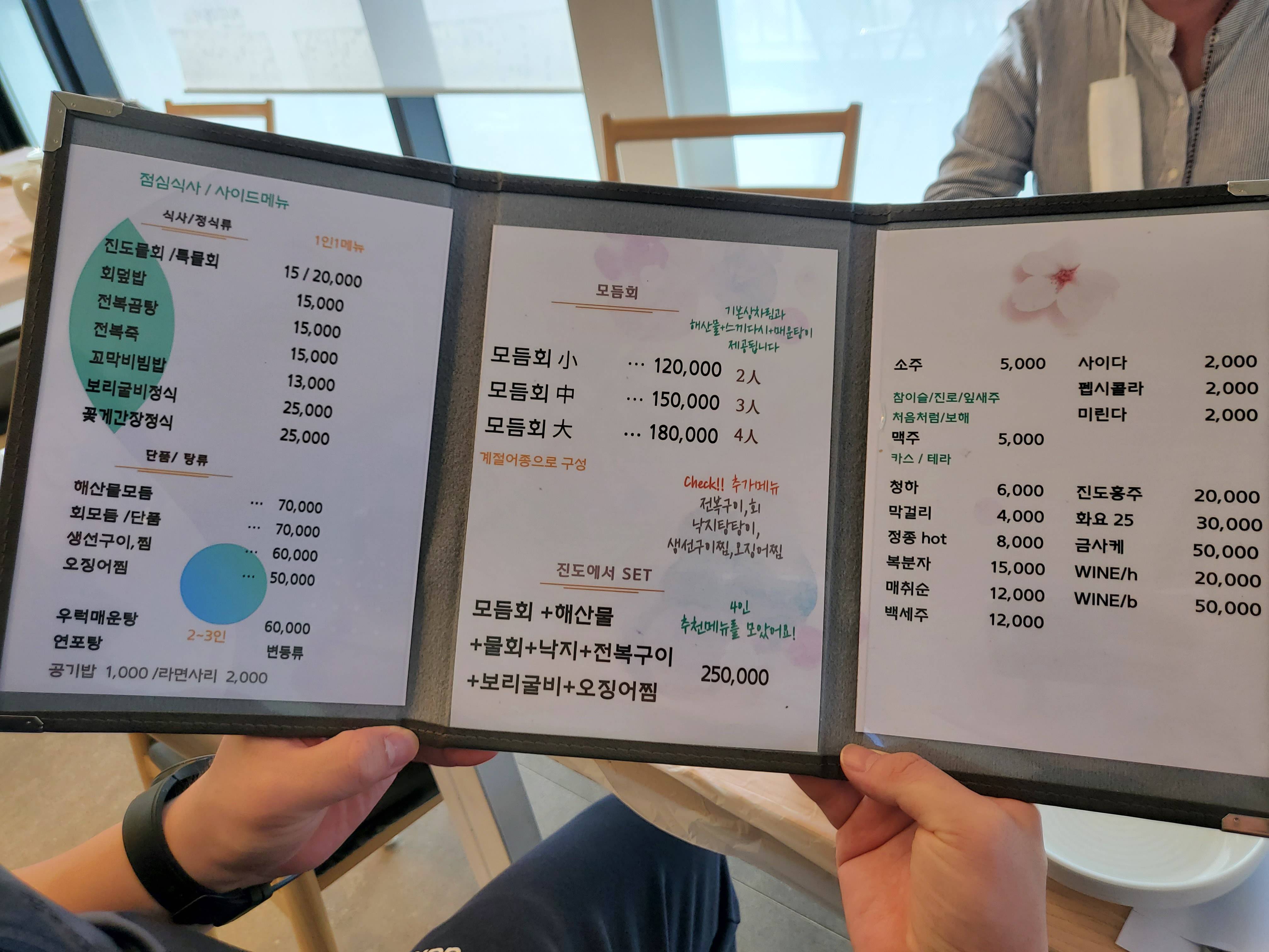 진도에서 횟집에서 제공되는 메뉴들과 가격대입니다.