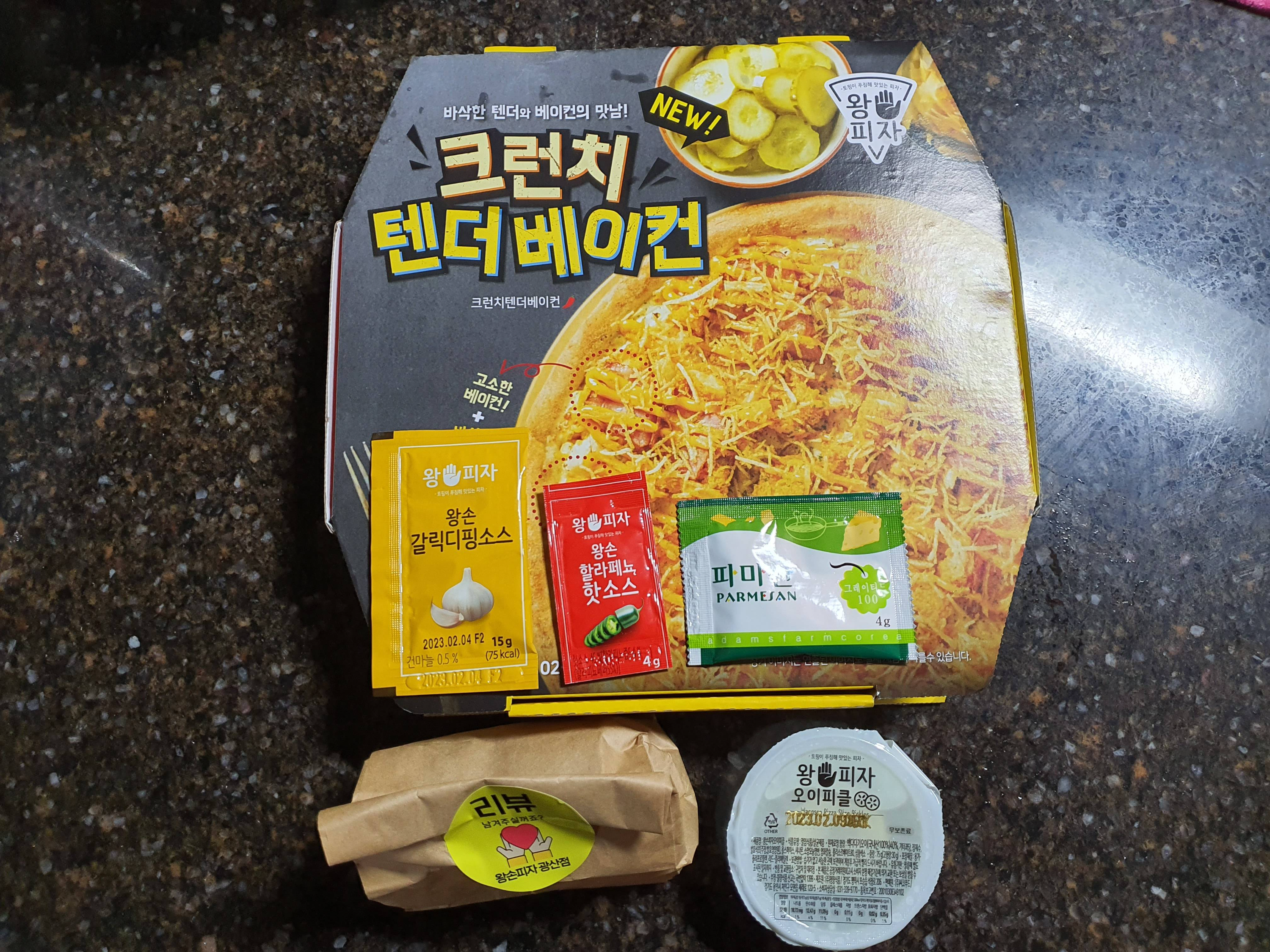 파마 치즈가루, 갈릭 디핑소스, 할라피뇨 핫소스, 오이피클에 리뷰 이벤트로 받은 새우 링의 구성입니다.