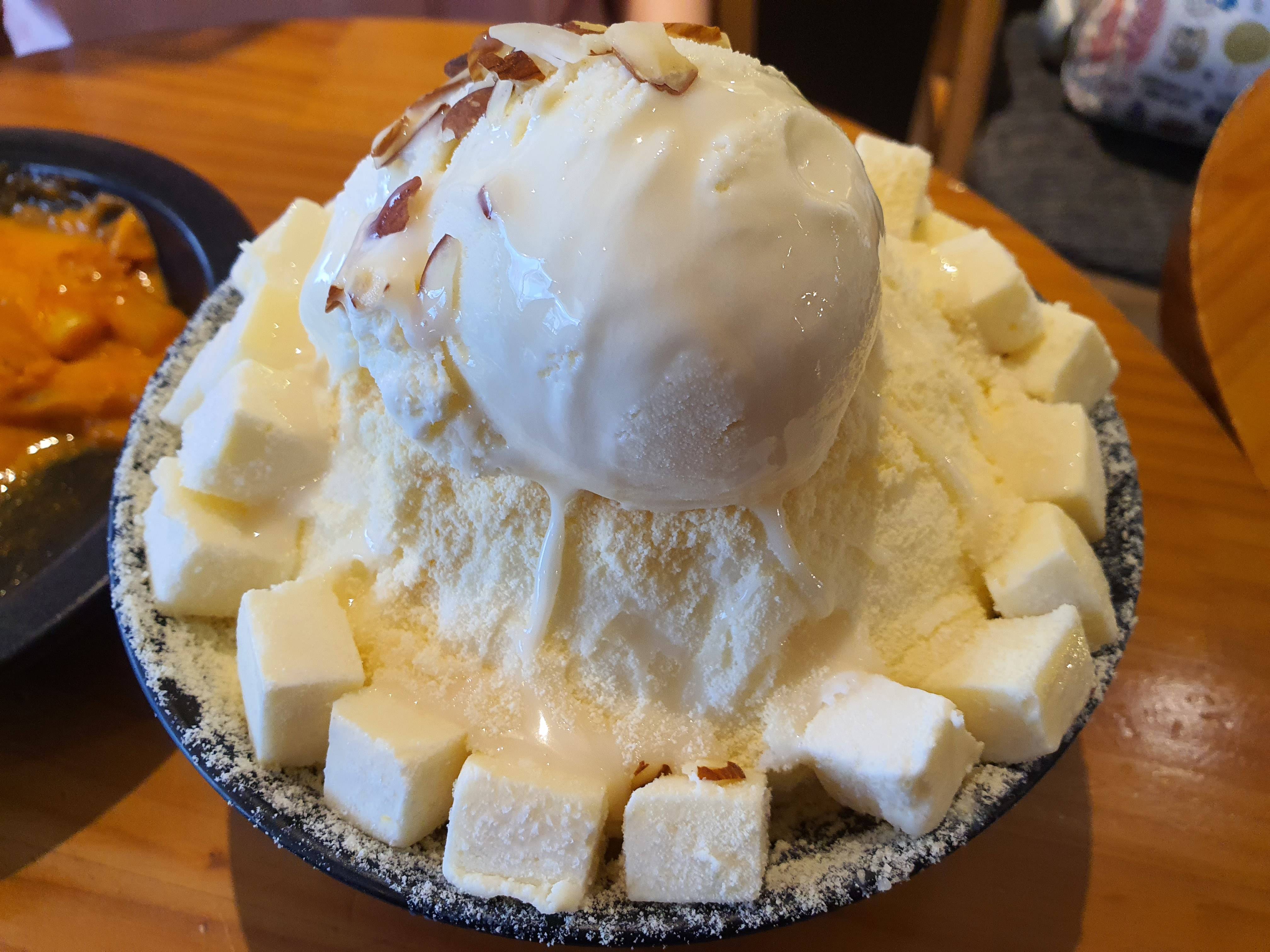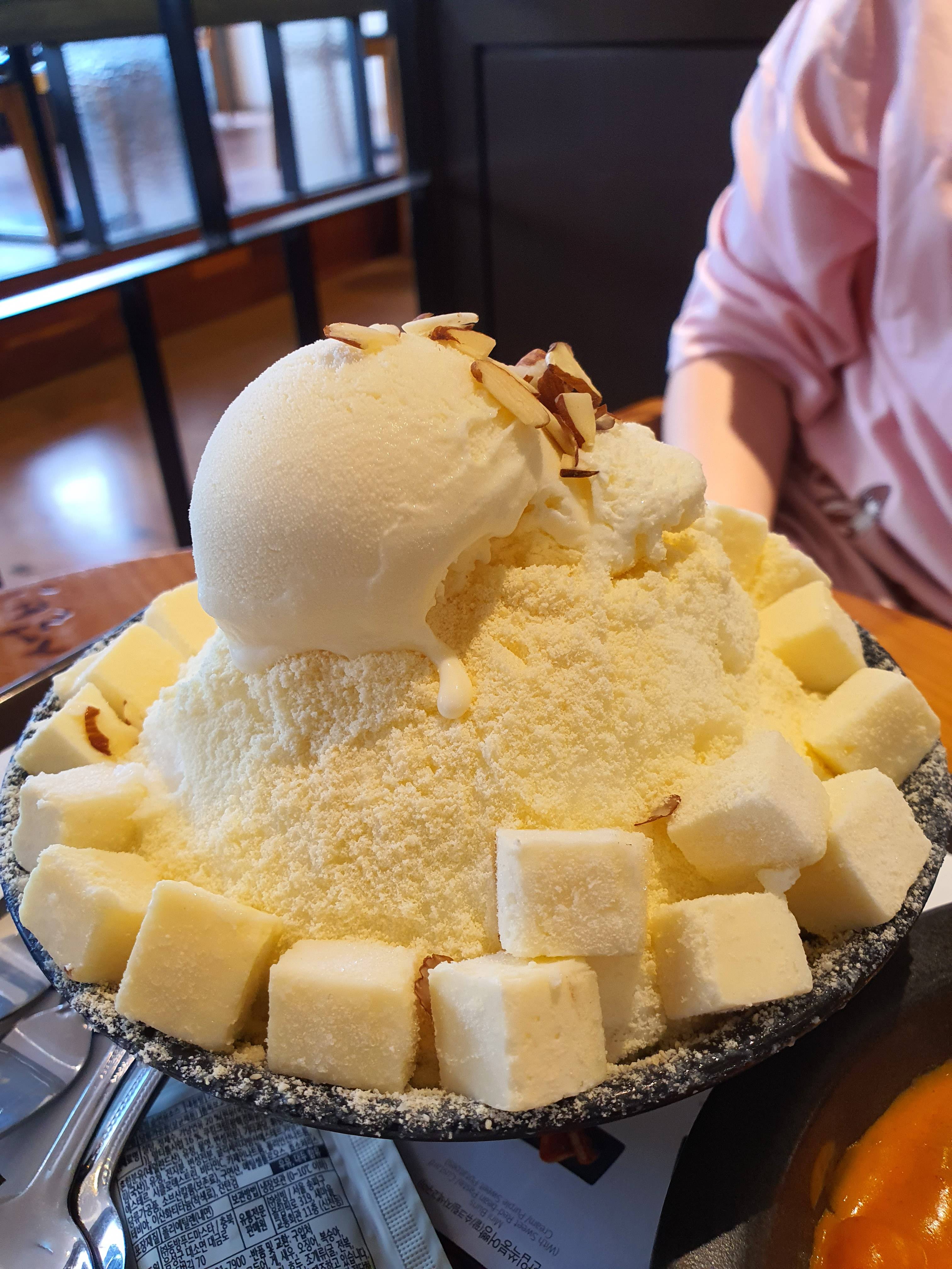 정육면체의 치즈들이 철옹성을 이루는 모양의 치즈 설빙입니다.