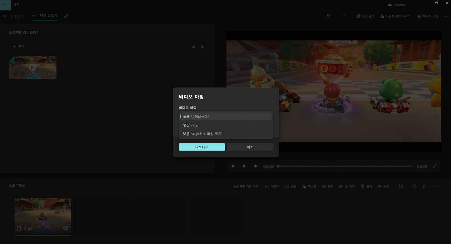 우리는 용량을 낮춰야 하기 때문에 "낮음" 540p 를 눌러주고 "내보내기" 버튼을 눌러 줍니다.