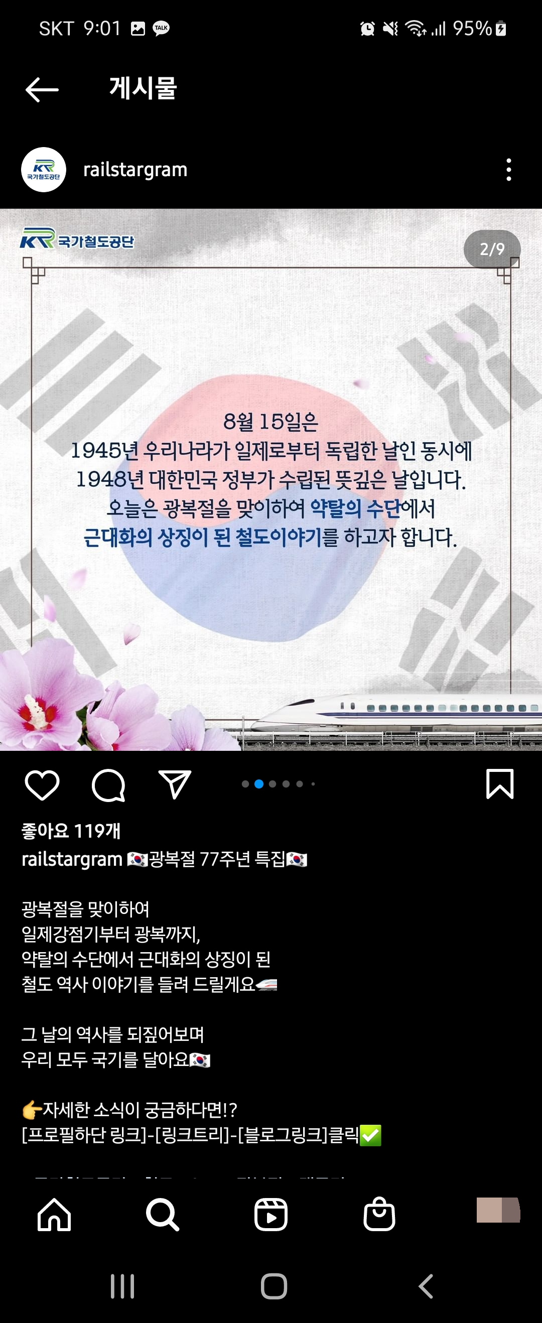 국가철도공단 운영하는 공식 인스타그램 채널에서 8.15 광복절을 맞이한 게시글을 하나 올렸습니다.