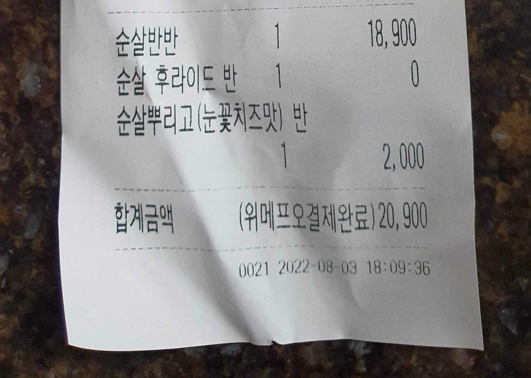 위메프 오로 결제로 배달료까지 합쳐서 20,900원이었습니다.