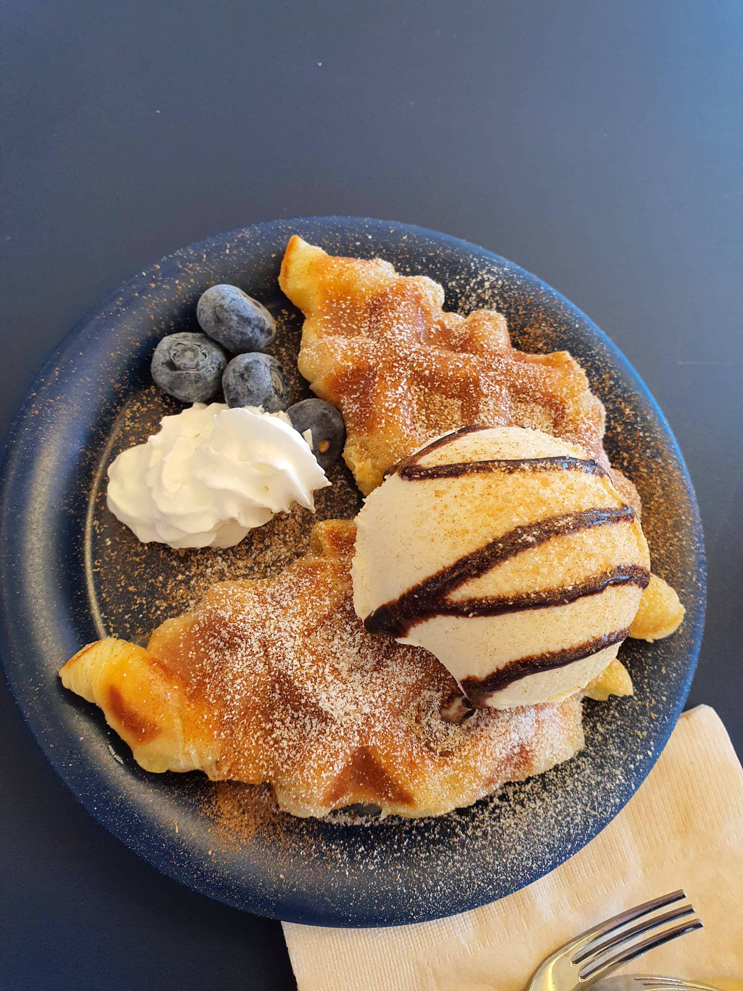큼지막한 크로플에 크림과 아이스크림 한 스푼 크게 한 덩이에 마지막 계핏가루로 홍일점을 찍었네요.