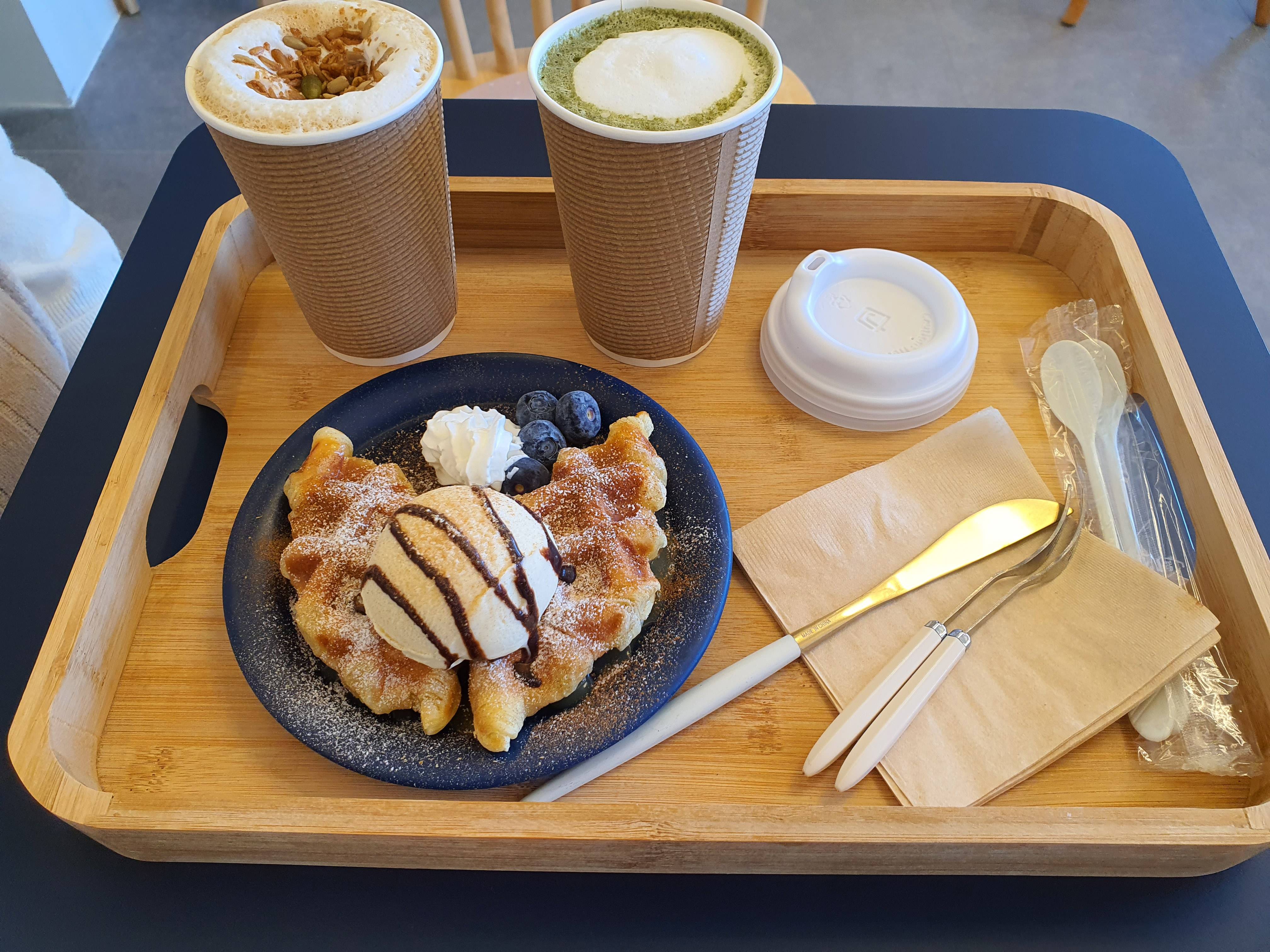 따뜻한 곡물라떼와 따뜻한 쑥라떼 그리고 크로플아이스크림입니다.