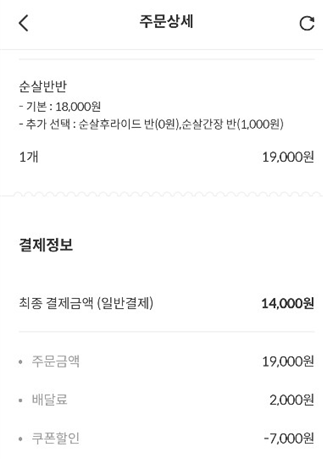 주문은 당연히 위메프 오로 했고 기본가 18,000원에 순살 공정 추가로 1천 원 추가돼서 19,000원인 가격이 위메프 오의 7천 원 할인쿠폰으로 12,000원이 되었다가 결국 배달비가 2천 원이 붙어서
