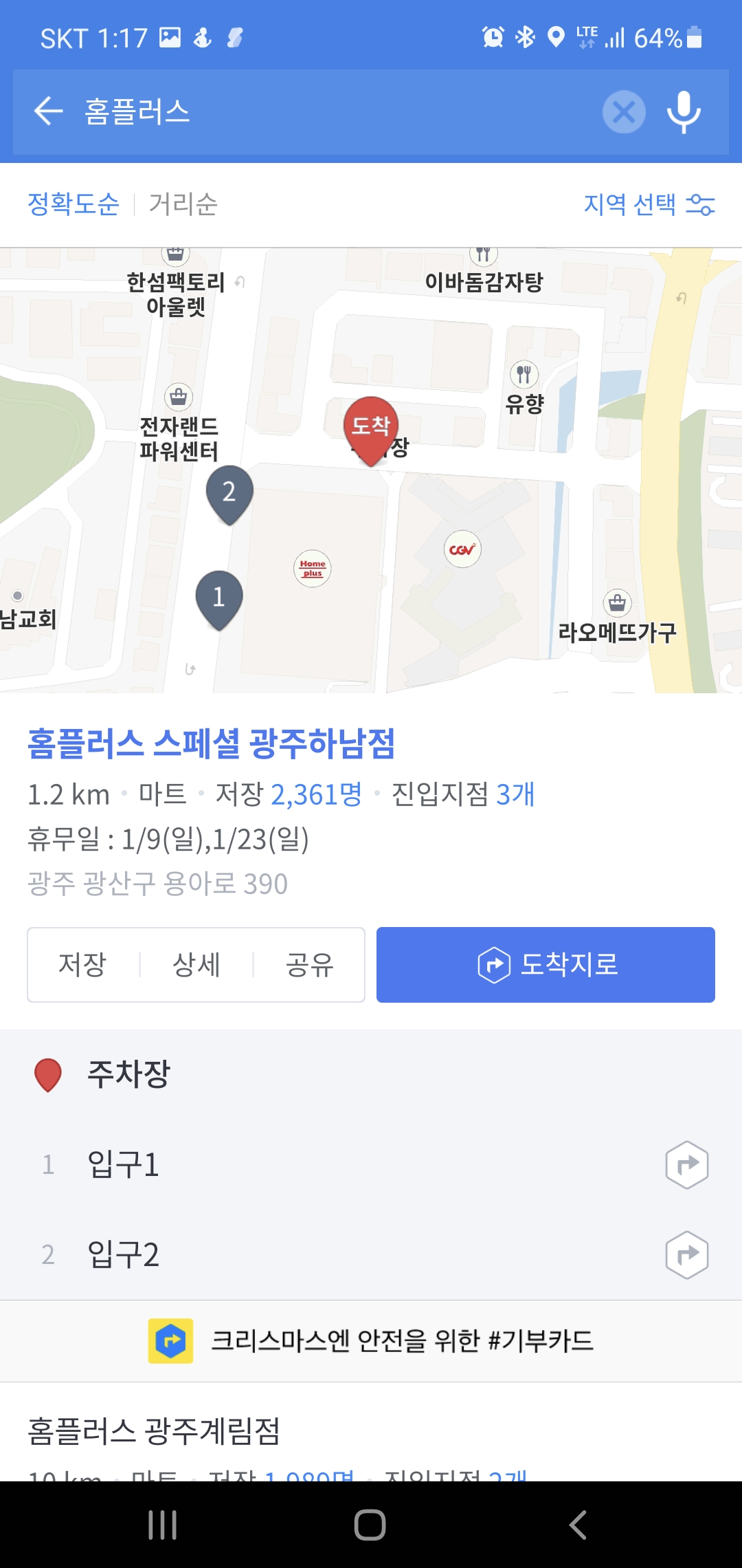 첫 번째 예시로 홈플러스 광주 하남점을 검색해 보니 중간에 휴무일이 표시가 되는 걸 볼 수 있습니다.