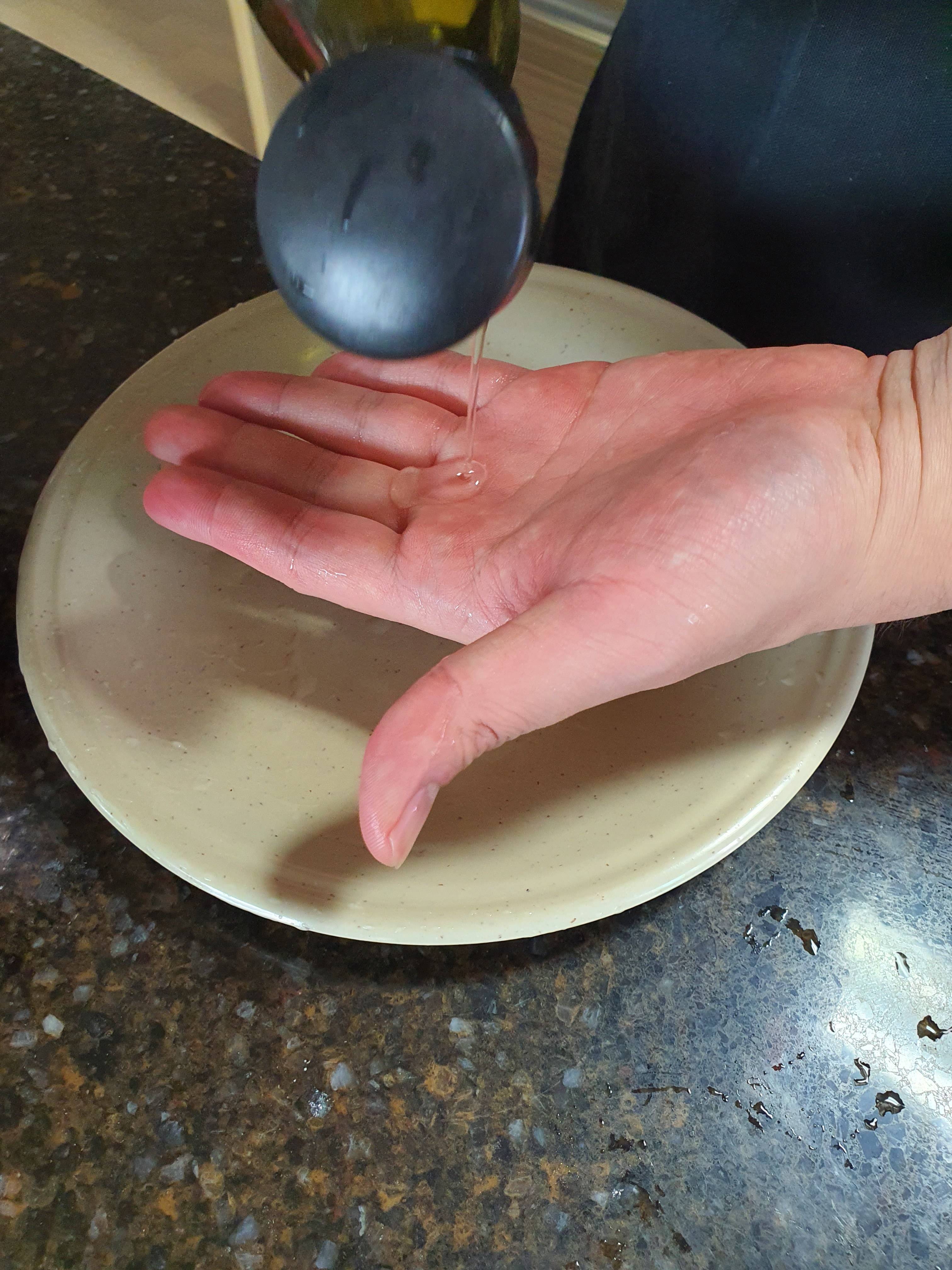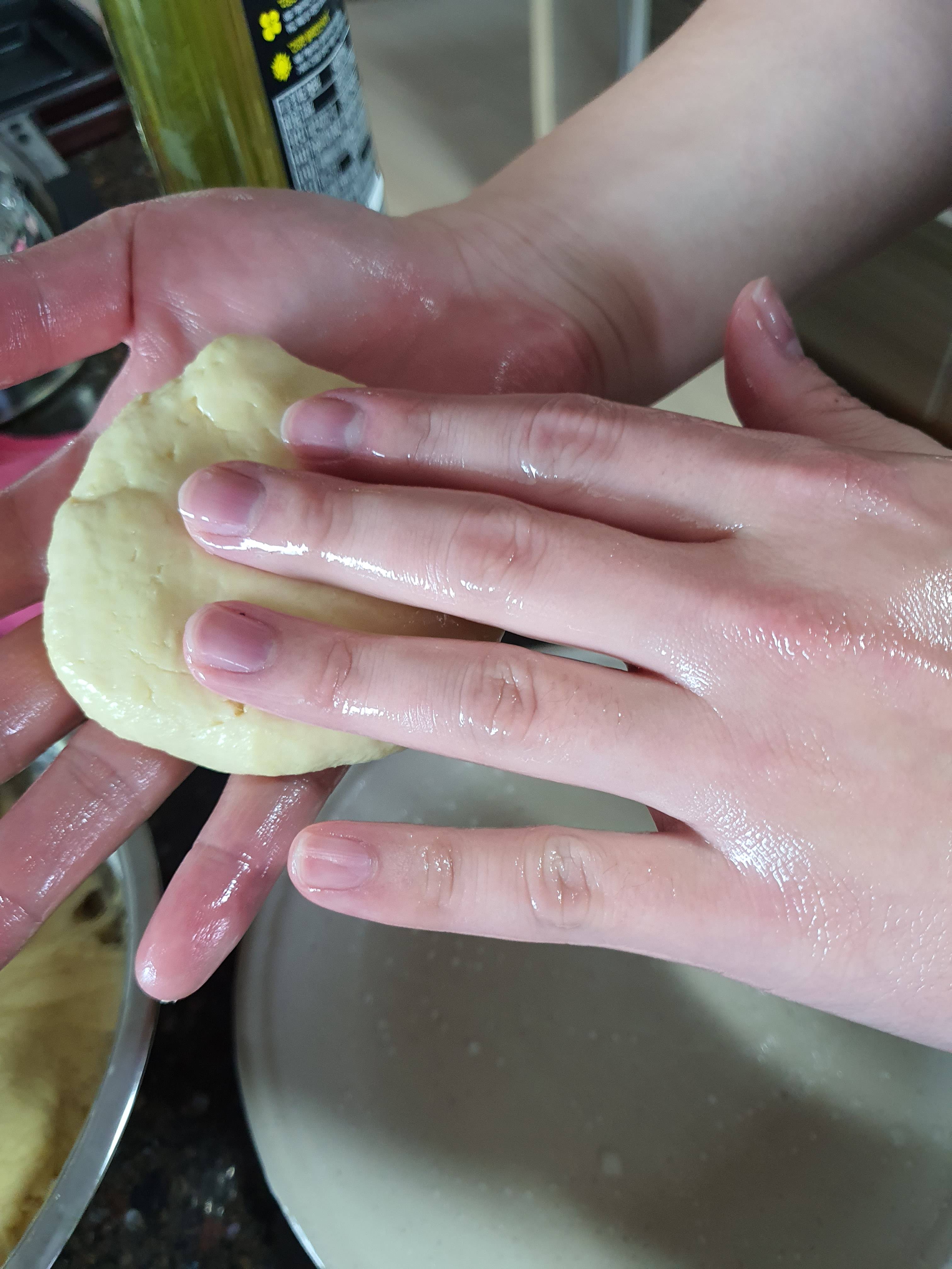 식용유보다 몸에 건강한 카놀라유를 손에 듬뿍 묻혀서 반죽을 손으로 빚어내야 합니다.