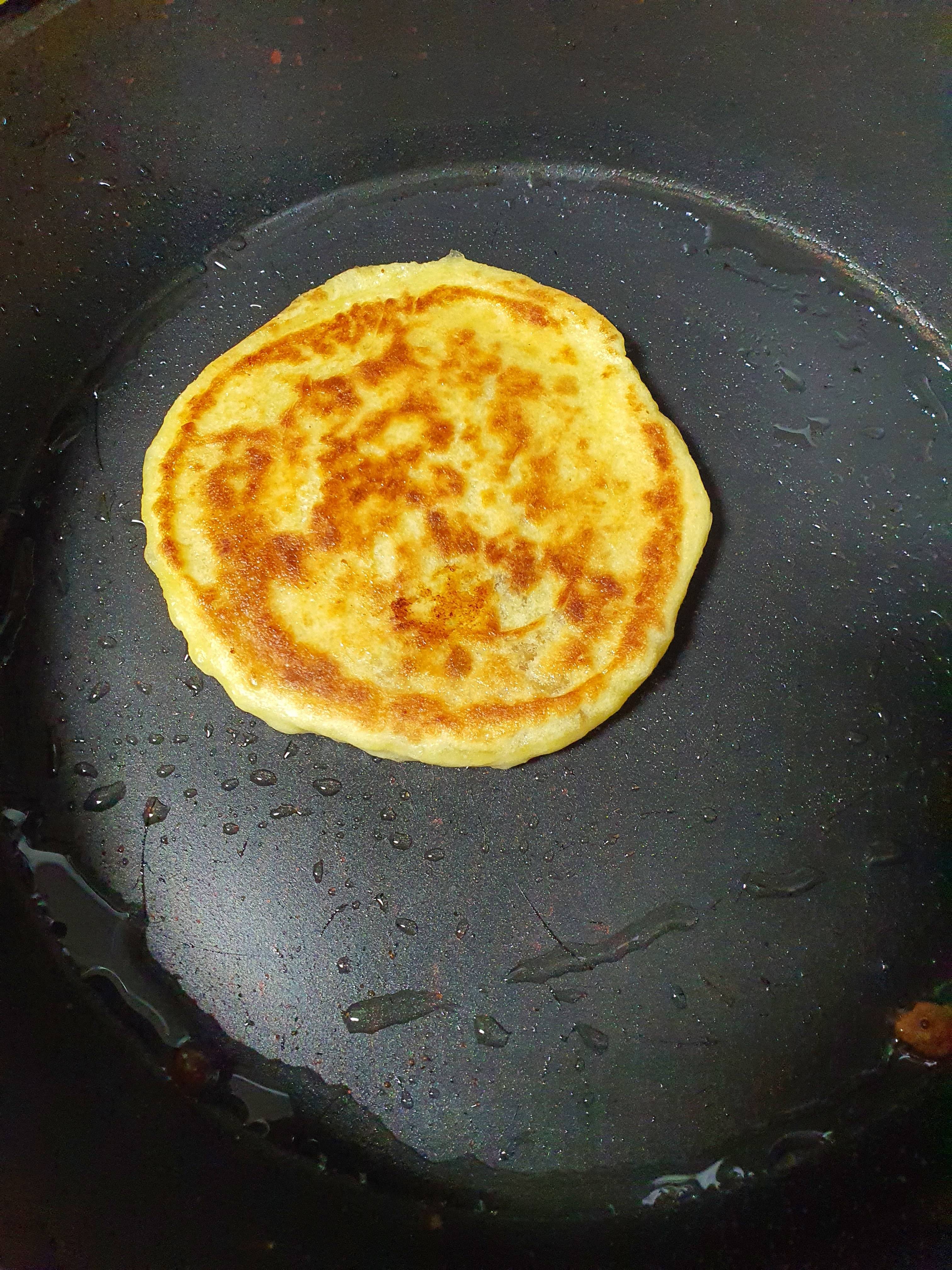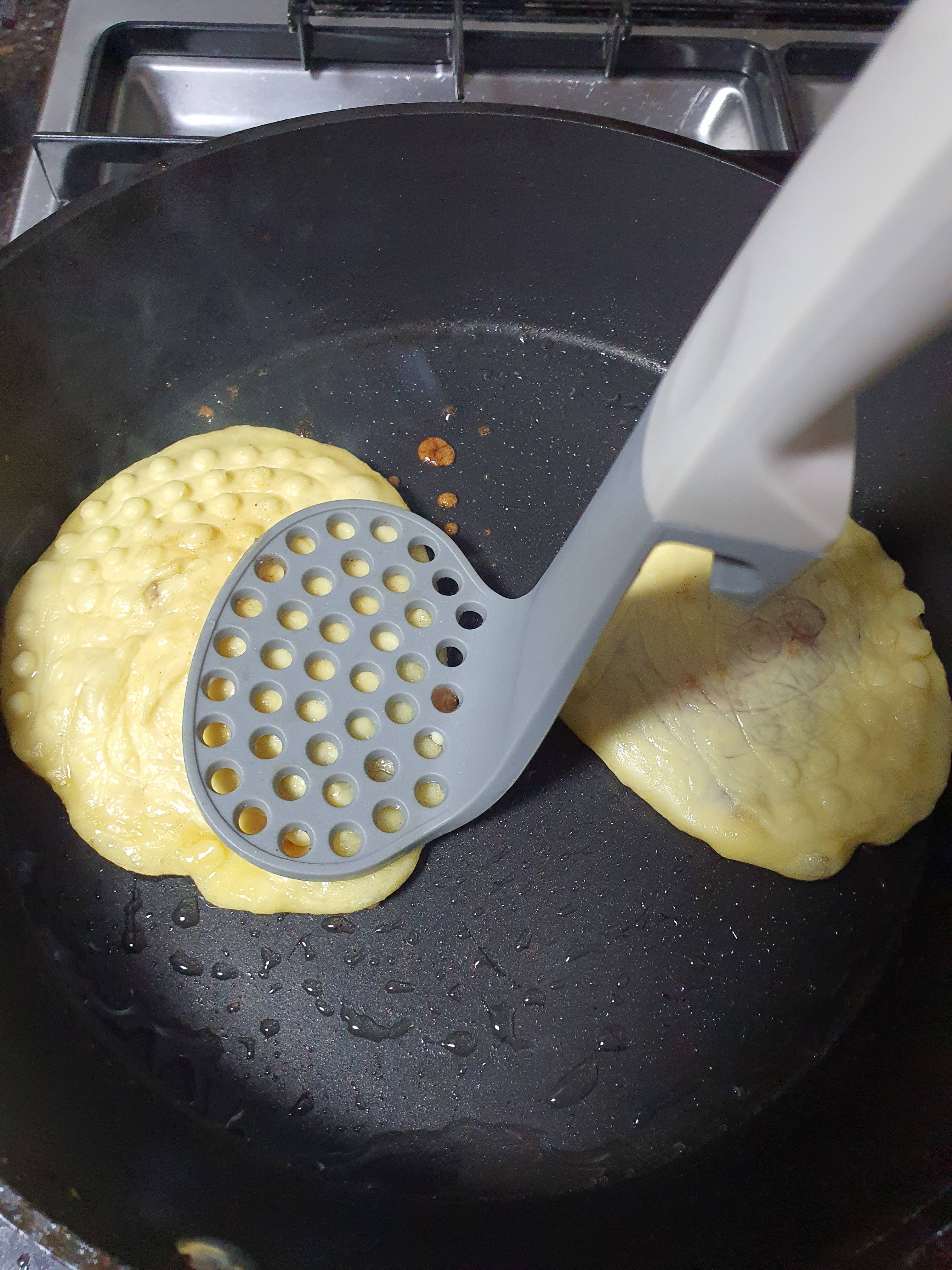 반죽이 얇으면 상관없지만 두껍다면 저렇게 눌러서 강제로 더 열을 받게 해 줄 수 있어서 고루 익혀줍시다.