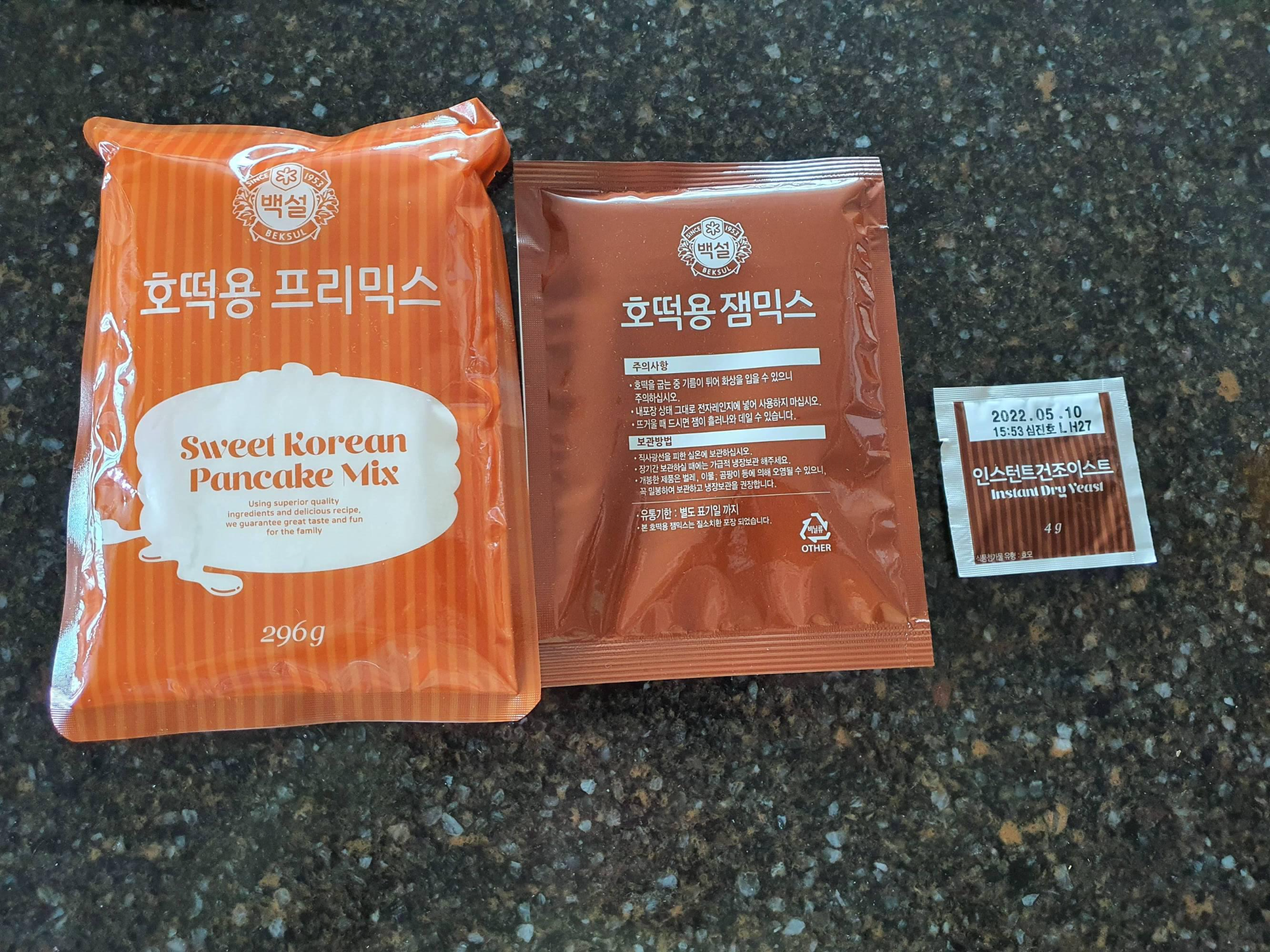 호떡 반죽용 호떡믹스, 이스트, 그리고 달달한 호떡용 잼믹스입니다.