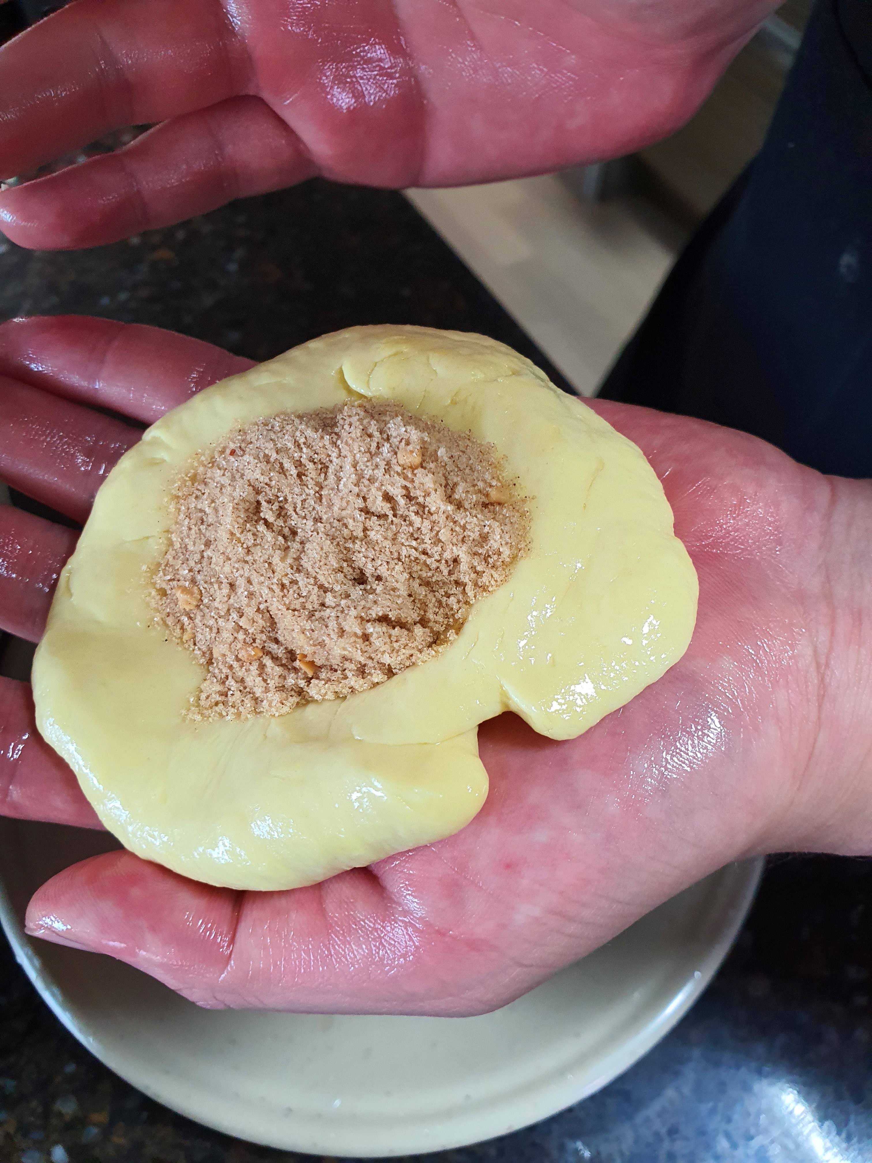 반죽을 적당량 크기로 넓게 원 모양으로 펴준 뒤 그 안에 호떡용 잼믹스를 원하는 만큼 넣어줍시다.