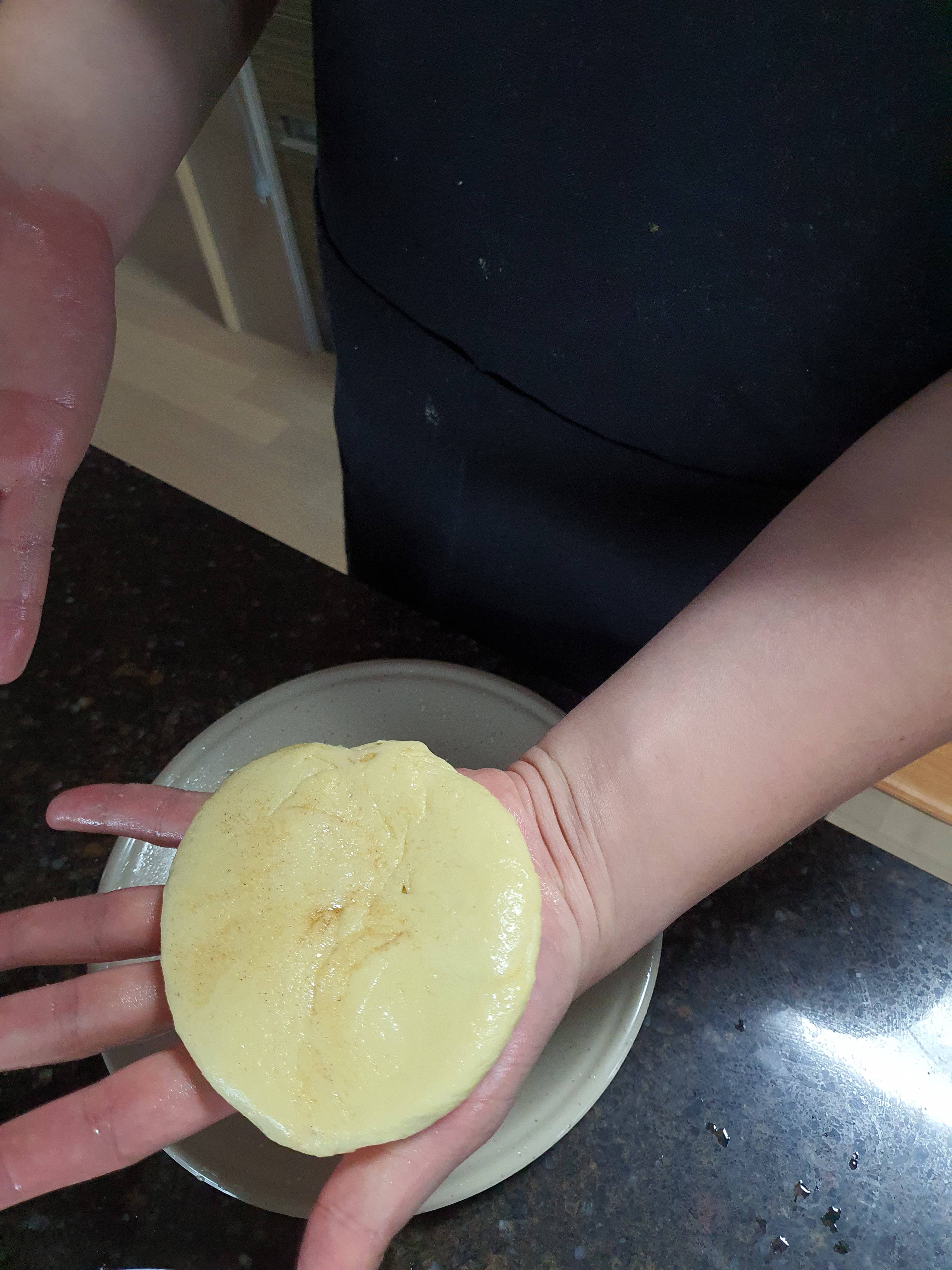 이거는 손 더럽히기 싫다고 비닐장갑 끼면 다 달라붙기 때문에 처음부터 맨손으로 반죽을 빚던지
