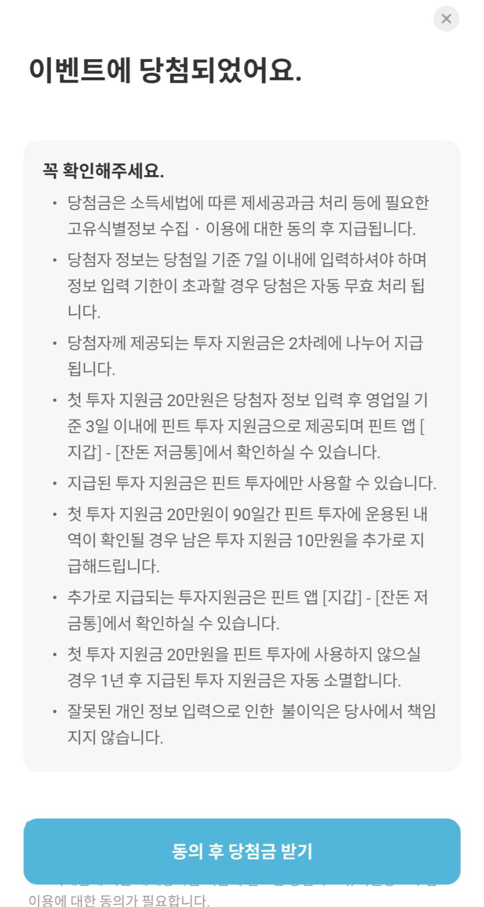 이후 당첨이 됐을 시 20만 원을 선금으로 지급을 해주고 이 20만원을 최소 90일 이상 핀트 내에서 투자로 굴려주면 추후 10만 원을 추가로 입금 받을 수 있습니다.