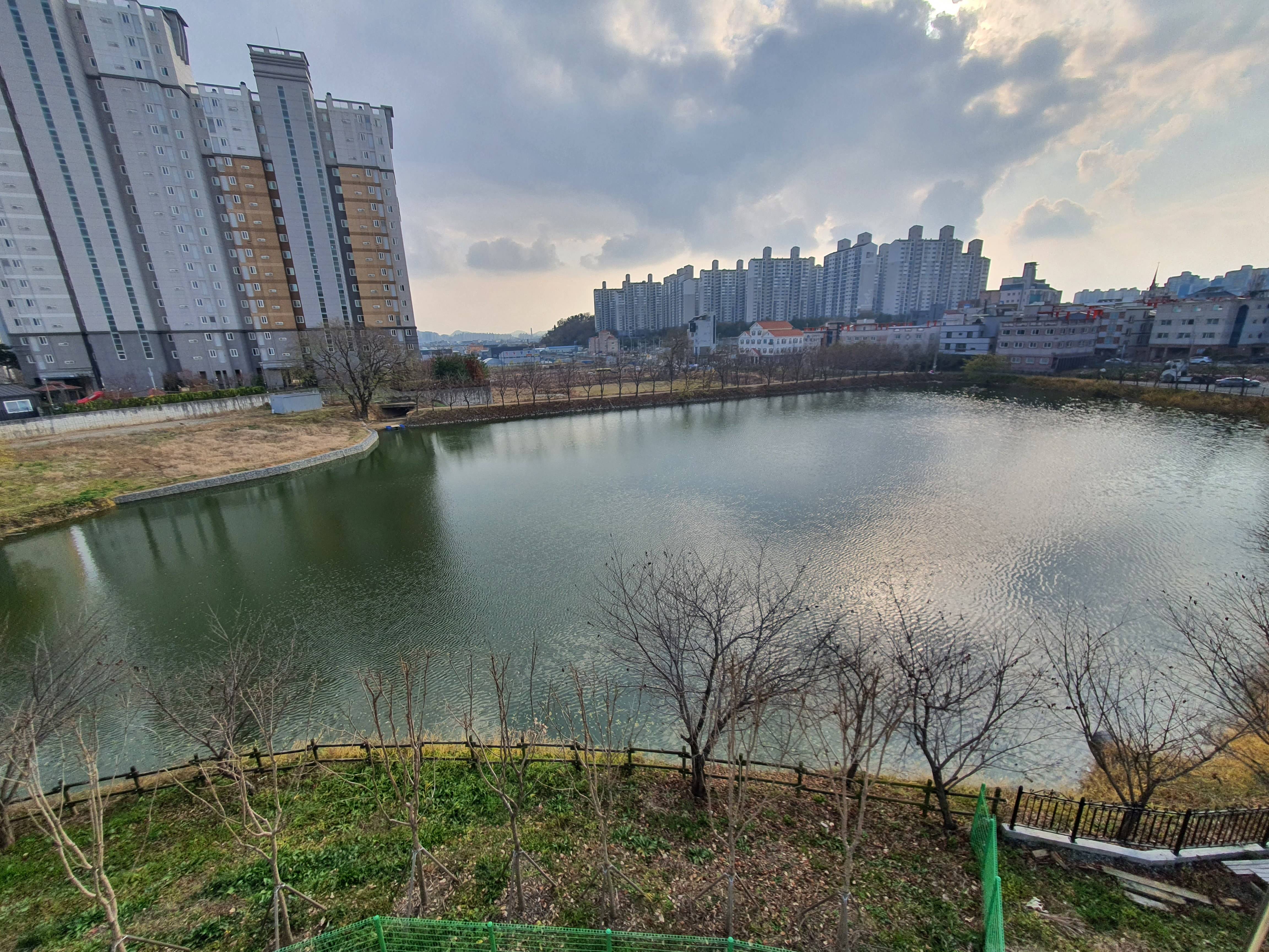 3층 안에서 계속 있다가 떠나기 전 잠깐 테라스 쪽 바깥으로 나가서 찍은 신창 저수지의 모습입니다.