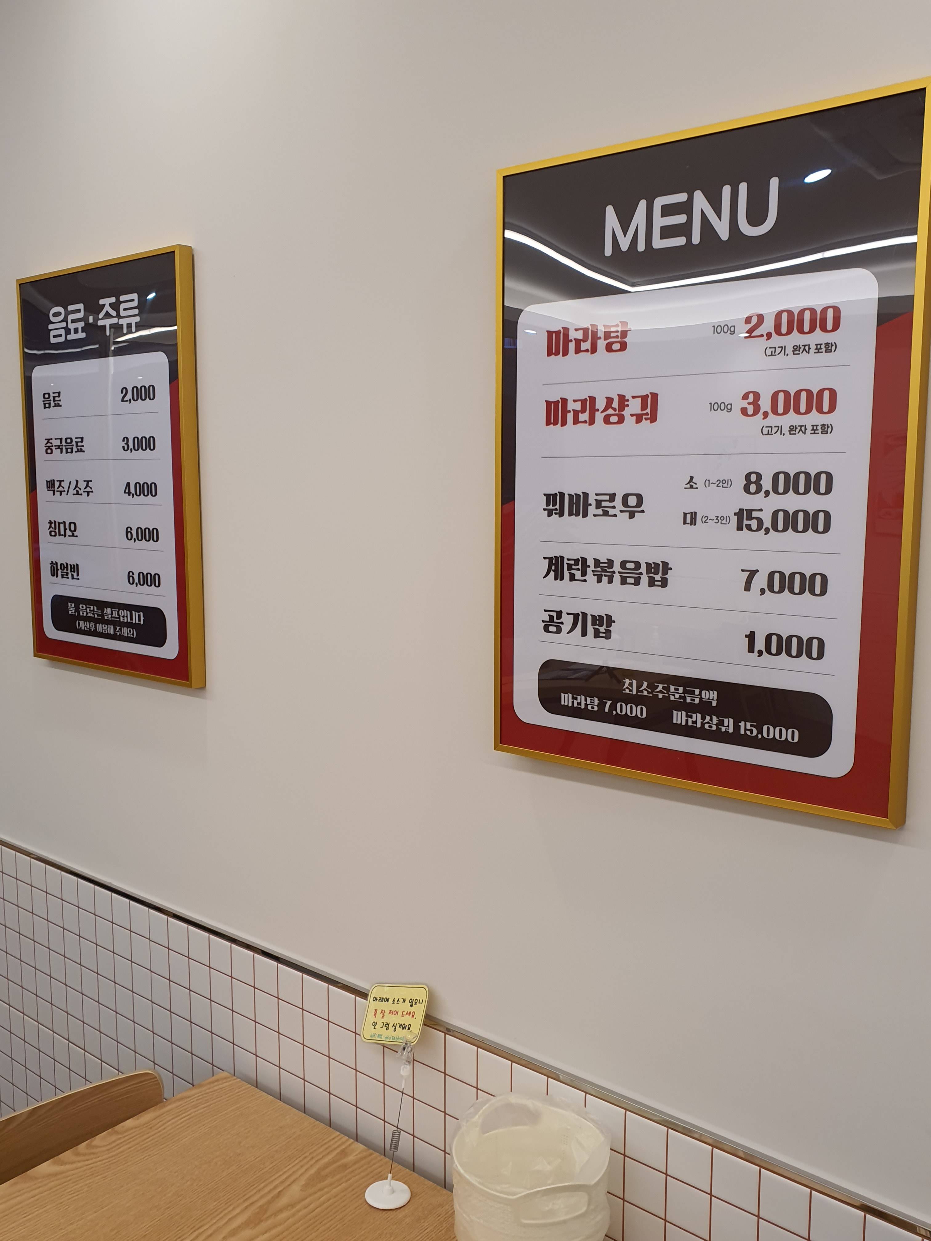마라탕 가게답게 메인 요리는 마라탕(최소 주문금액 7천 원), 마라샹궈(최소 주문금액 15,000원)가 있으며 그 외 꿔바로우나 계란볶음밥 정도로 메뉴가 간단해서 주문 때 적어도 고민할 필요는 없어서 좋은 듯합니다.