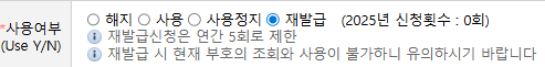 여기서 우리는 개인통관고유부호의 "재발급"을 해야하기에 "사용여부" 항목에서 재발급을 클릭하고 "저장"을 눌러줍니다.