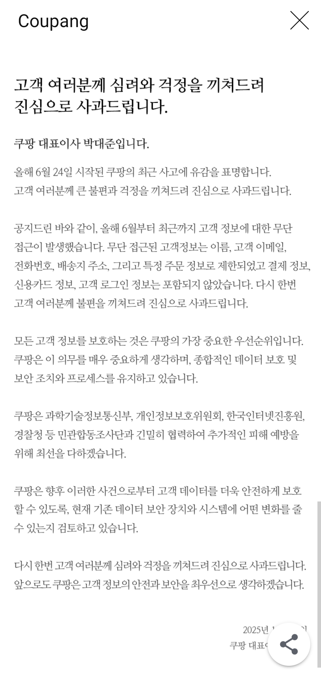 COUPANG의 심각한 개인정보유출사태