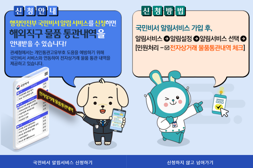 국민비서 알림서비스를 신청하면 실시간으로 해외직구 물품의 통관내역 알림을 받을 수 있습니다.